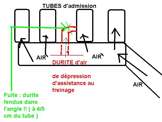 Bonjour tout le monde ! Après un "diagnostic" approfondi de ma part à l'instant ( cette après midi ), je viens de remarquer que cette durite est en fait en "coude" ( petit rappel : c'est la durite de depression d'assistance au freinage ), et que surtout, ce coude part des tubes d'admission directement !! Je vous montre sur un schéma "grossier" que je viens de faire comment ça se trouve. [attachmentid=17860] Ainsi, je comprends pourquoi mon voyant moteur s'est allumé avec comme code défaut "problème de richesse- mélange trop pauvre" : la "fuite" d'air est juste à "coté" des tubes d'admission! Du moins, qu'en pensez vous ? :) -