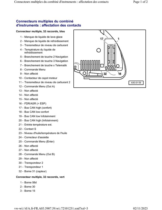 Alors re-bonjour tout le monde désolé pour le déterrage de post mais bon je n'ai pas chômé non plus e mon coté Donc oui SafraV6ine tu as bien raison il s'agit du déphaseur d'arbre à cames de ce coté là. J'ai vu que la prise donc de ce déphaseur était casé (plus de clipse pour la tenir) je l'ai donc changé mais le code défaut est toujours là..... et oui ça aurait était trop facile haha Je vois que dans tes postes à aucun moment tu incrimines le déphaseur en lui même, tu penses pas que c'est une pièce qui avec l'âge aurait pu tomber en rade ? Et deuxième chose qui me donne du fils à retordre : J'ai donc vérifié coté prise, mais maintenant j'aimerai bien vérifier de l'autre coté du fil (coté calculateur je pense) au moins pour faire un test de continuité pour être sûr qu'un fils n'est pas coupé comme tu le dis. Sauf que je n'arrive pas à mettre la main sur des schémas elec pour retrouver ce malheureux câblage. Et donc si mon test de continuité ce passe bien alors je pourrais incriminer avec certitude mon déphaseur ! Donc si quelque a ce schéma ou peu juste m'indiquer où se trouve ce calculateur et sur quels pin il me sauverait ! En tout cas encore désolé pour cette réponse tardive et merci beaucoup pour ton aide ! -