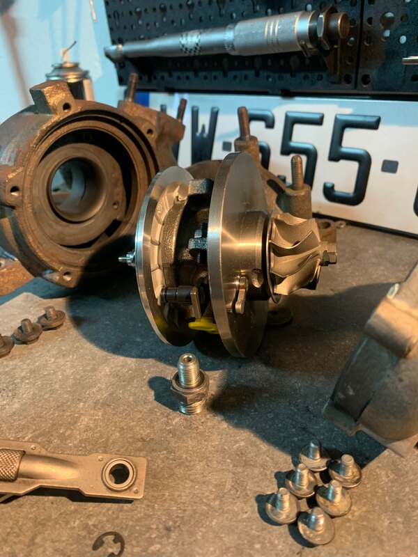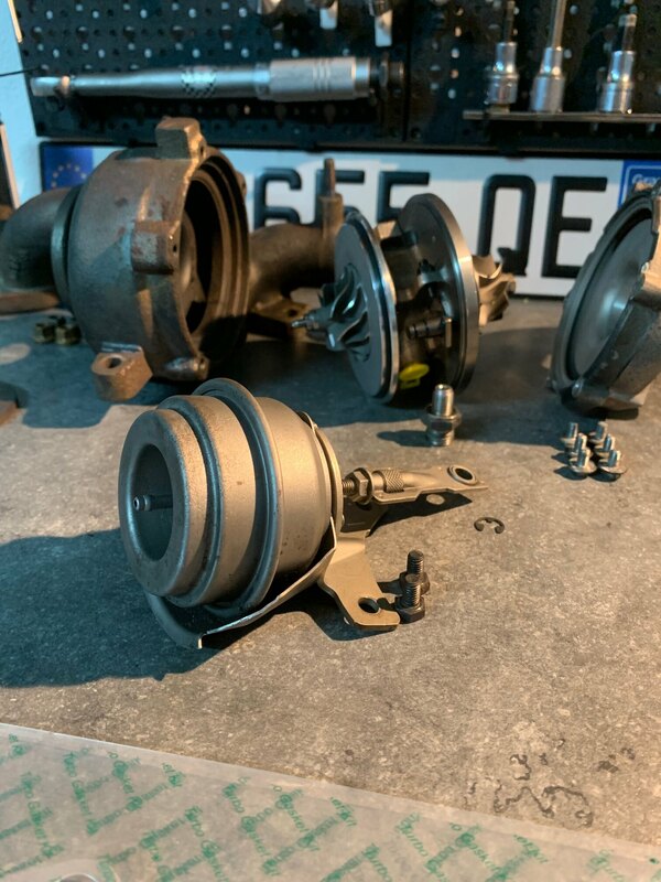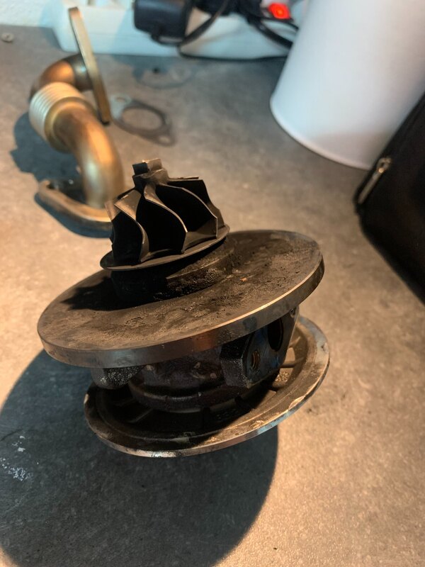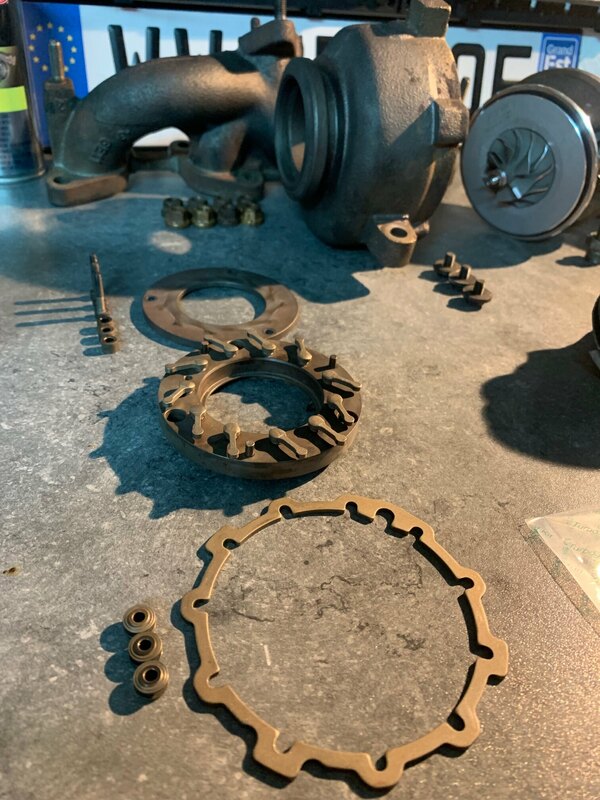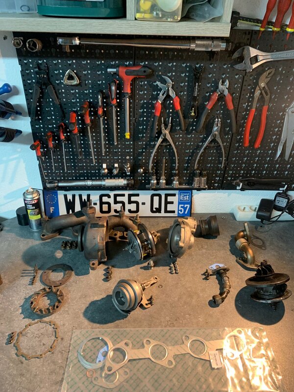 @LCL2000 Ça y est! Problème résolu! Pour le sifflement restant… eh bien il s’agissait bel et bien du CHRA du turbo… qui n’a pourtant que 10k bornes… j’ai donc changé le CHRA et nettoyé complètement la géométrie variable au SUPERMAFRASOL puis passé un coup de WD40 sur les aubes… résultat: impeccable!!! Plus le moindre bruit! Ça fait du bien aux oreilles. J’ai également remis la cartographie d’origine afin de ne plus être embêté après les 200k km. J’ai installé cependant un joint réducteur en sortie de radiateur EGR. Il permet en théorie de supprimer la vanne EGR jusqu’à 90%. Et honnêtement… ça fonctionne! Presque autant de reprise qu’avec le stage 1! Une fois le turbo réamorcé, une vidange a bien entendu été réalisée avec le filtre à huile neuf… Pour terminer, je viens d’acheter le filtre à carburant ainsi que la dernière durite de suralimentation non changée (celle qui sort du turbo). Comme ça, on peut le dire, tout est neuf! Pour ceux que ça peut aider/rassurer, voici une photo du travail réalisé sur mon turbo. A mon avis, vu l’état de la GV avant nettoyage, ça ne devait pas aider non plus pour mon défaut de pression trop élevé… en général les aubes tournaient bien, mais une ou deux étaient vraiment récalcitrantes… -