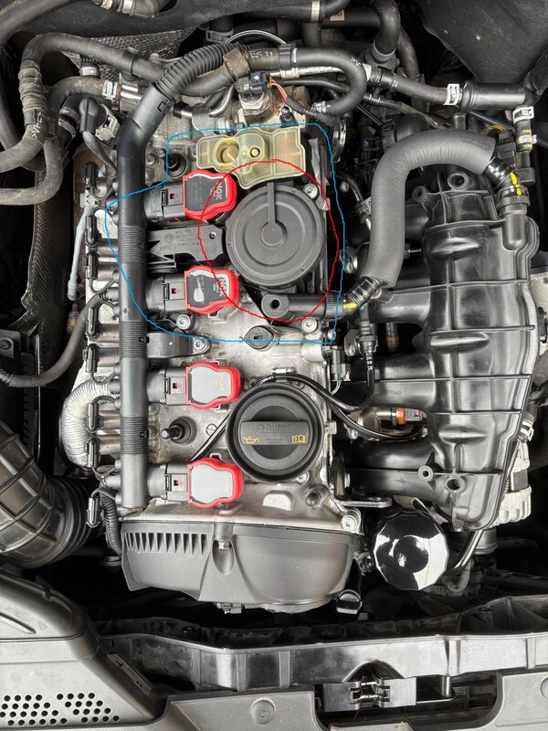 Bonjour à tous, Aujourd'hui je recréer un post, dans l'optique de vous aider à bien diagnostiquer une vanne PCV défectueuse, toujours sur moteur EA888.2, dans le cas présent un code moteur CDNC. Entre autres soucis mécaniques, lors d'un passage à la valise avec VCDS, je me suis apperçu d'un code défaut P2187 sur le calculateur moteur. Nous allons donc voir dans ce post à quoi correspond ce code défaut, comment diagnostiquer les différents éléments qui constituent le système PCV, et comment remplacer la membrane SEULE du séparateur d'huile (je pourrais aussi montrer comment remplacer toute la PCV valve, mais d'innombrables tutoriels français existent déjà pour cela). Commençons par expliquer le code P2187. Ce code indique que votre moteur tourne trop pauvre au ralenti. Cela peut provenir d'énormément de choses, je ne vais pas tous les décrire dans ce tuto qui n'est pas dédié à cela, mais il peut provenir : - D'une prise d'air quelque part sur votre système : Un rear main seal décollé, un joint de valve PCV, la membrane PCV, un joint de cache culbuteur etc... - D'injecteurs encrassés, de pompe HP défectueuse, d'un filtre à carburant partiellement bouché etc... - Du système EVAP - Des capteurs O2 - etc... Comme vous pouvez le voir les causes sont multiples. En revanche afin de mieux vous aiguiller si comme moi vous possédez un EA888.2, commencez par vérifier le système PCV et le Rear Main Seal (joint principal arrière du vilebrequin), qui se situe à la jonction entre votre moteur et la boîte de vitesses. Vous ne pourrez évidemment pas le voir sans tomber la boîte, mais s'il fuit, vous devriez remarquer un suintement d'huile au niveau de cette jonction. En ésperant pour vous que ça ne soit pas le cas... la main d'oeuvre est très couteuse pour cette opération. Ci-dessous un apperçu du code dans VCDS : Il est également important de rappeler quels sont les symptômes physiques d'une PCV valve HS. Si votre PCV est HS, vous pourriez ressentir les symptômes suivants : - Ralenti instable, en permanence si très endommagée ou à certains moments si peu endommagée - Augmentation de consommation du carburant, dûe au fait que le mélange air/essence ne sera plus optimal, dans ce cas, puisqu'il s'agira d'une prise d'air, le système tournera trop pauvre car un surplus d'air rentre dans le moteur - Fuite d'huile : En effet vous pourriez remarquer la présence d'un suintement d'huile autour de la membrane PCV, ou un petit "bain" d'huile tout autour sur le dessus du moteur. La consommation d'huile peut aussi être un symptôme Pourquoi et comment tester rapidement et simplement chaque éléments principaux de son système PCV ? Tout d'abord, pourquoi "s'embêter" à tester chaques composants du système PCV quand on peut tout simplement la remplacer intégralement? D'une part parce que vous n'êtes même pas sûrs à 100% que le problème vienne de la PCV en elle même, et d'une autre parce qu'une PCV valve complète est environ quatre fois plus chère que chaque réparation que je pourrai vous proposer dans ce tuto. Alors par où commencer? J'ai tendance à souvent aller du plus évident au moins évident, donc faisons ainsi ! ___________________ Première chose à faire : Ouvrez le capot, retirez le cache moteur, et regardez le cache culbuteurs. Si le dessus de ce dernier est plein d'huile autour de la PCV (dans la zone entourée en bleu sur la photo), alors vous pouvez être certain que le joint entre ces deux pièces là est à remplacer. Attention à ne pas vous précipiter ! En effet la présence d'huile sur le cache culbuteur peut aussi provenir d'un joint de carter supérieur de distribution (qui est en plastique) HS ! De la même manière, regardez au niveau de la membrane de la valve PCV (zone en rouge sur la photo), si sur le plastique vous constatez un filet d'huile, il est fort possible que la membrane soit percée ! Deuxième test : Vous pouvez effectuer un second test très simple. Collez votre oreille à ces endroits : - Membrane PCV, si la membrane est percée vous entendrez un sifflement allant d'une sonorité aigüe à très aigüe - Tubulure qui part du collecteur d'admission et qui arrive sur la PCV, l'espèce de "clip" qui retient se dernier de chaque côté est peu être cassé ou désemboité Troisième test : Une autre manière de voir rapidement si la membrane est percée sans rien démonter, c'est de placer un doigt sur le petit trou qui se situe sur le couvercle de la membrane PCV, en face du profil "rectangulaire" sur ce dernier (entouré en rouge sur la photo ci-dessus). Si votre doigt est aspiré, alors la membrane est percée. Pour ma part ce test n'a pas été concluant, pourtant après remplacement de ma membrane, je n'avais plus de sifflement... j'en conclu que l'air peut donc aussi passer "sur les côtés" de la membrane quand celle-ci est usée... Quatrième test (concernant le clapet anti-retour) : Vous l'avez compris, les prises d'air/fuites d'huile peuvent provenir soit de la membrane PCV qui est percée ou trop usée, soit du joint situé entre la PCV valve et le cache culbuteur, soit au niveau de la tubulure d'entrée du système PCV, en provenance de l'admission. Je n'en ai pas parlé, mais il arrive parfois que la tubulure en acier qui part de la PCV pour descendre sur le turbo soit également percée. Cependant, votre valve PCV peut aussi mourir d'une seconde manière... En effet il existe à l'intérieur de cette pièce en plastique, juste à l'entrée du système, un clapet anti-retour, chargé d'autoriser une dépression au sein de la valve PCV en provenance du collecteur d'admission, mais PAS une pression (par exemple lorsque le turbo va charger). Un test simple pour s'assurer de son bon fonctionnement consiste à déconnecter la tubulure d'entrée PCV au niveau du collecteur d'admission, et en supposant que la tubulure soit OK, aspirer à l'intérieur. Vous êtes sensé pouvoir aspirer librement. En revanc