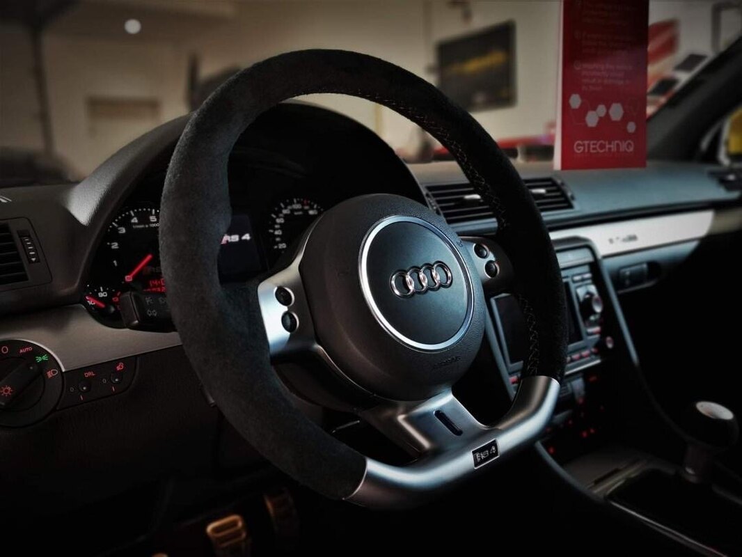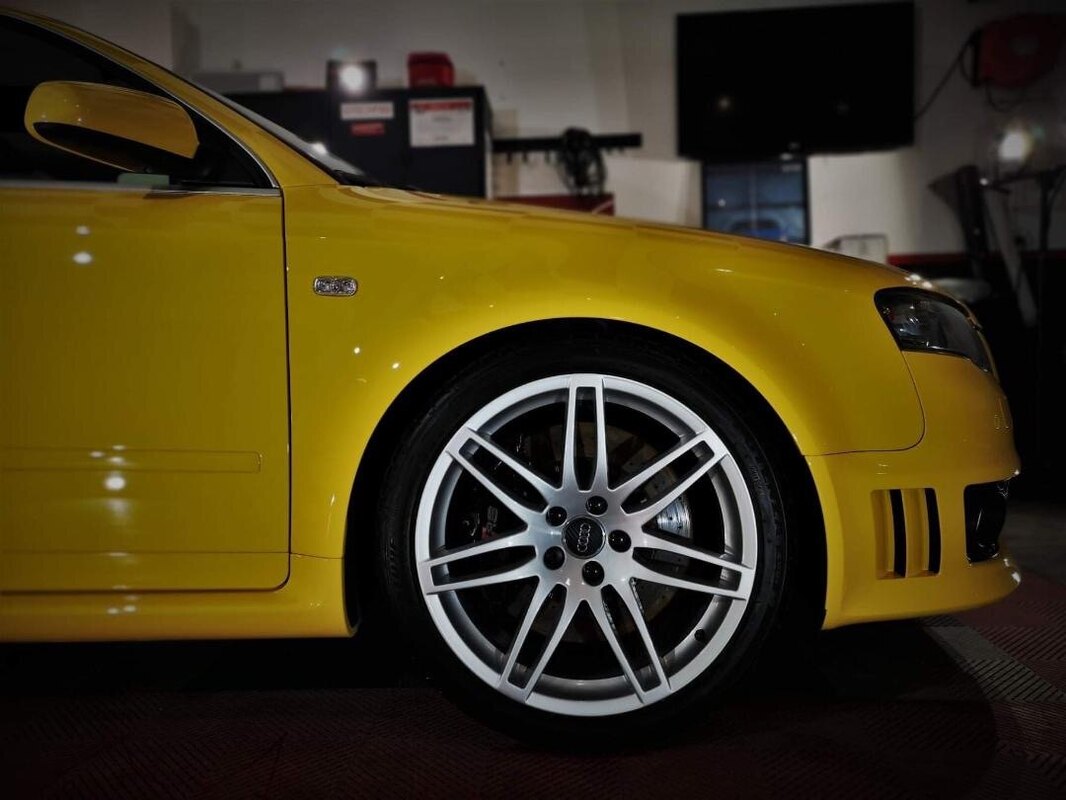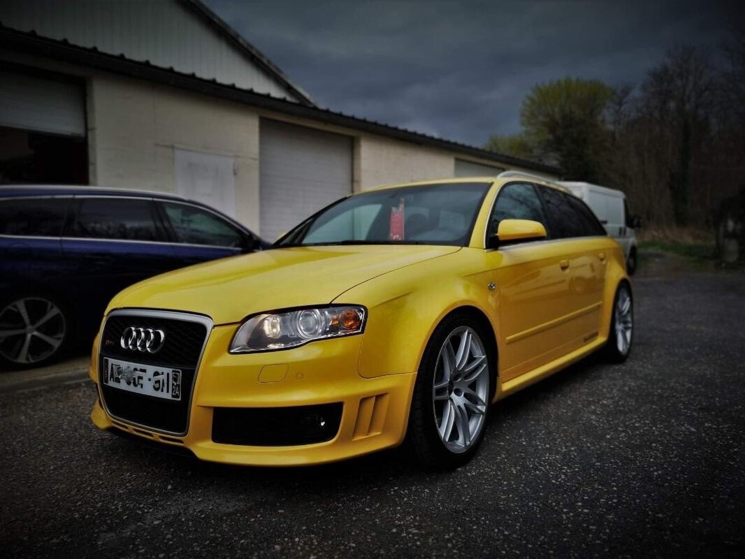Bonjour à tous, Après m’être récemment présenté, je vous présente celle qui m’a fait entrer dans le mon merveilleux d’Audi : une RS4 B7 jaune Imola de 2006. Pour la petite histoire, ayant mis une alerte sur Le Bon Coin depuis plusieurs mois, j’ai sauté sur une annonce postée la veille au soir, d’où l’intérêt de se lever tôt… Sauf que manque de chance, après avoir obtenu la priorité pour la voir, le vendeur la retira de la vente ayant reçu trop d’appels … … mais me rappela finalement 3 semaines plus tard, alors que je m’intéressait à une belle white Edition : il s’en est fallu de peu pour qu’elle m’échappe ! J’étais prêt à la prendre au prix mais près une petite négociation par principe, elle était enfin dans mon garage. Quelques photos : Origine française, historique des entretiens connu depuis les 20 000 Km (fourni par une concession Audi qui souhaitait l’acquérir) + classeur des factures. Principales interventions effectuées : - à 65 000 km : modification du cyclone ( est-ce la suppression des flaps d’admission ?) évidage des pré-catalyseurs - à 95 000 km : DRC remplacé par des Bilstein B14 PSS - à 106 560 km : remplacement groupe embiellé + rodage soupapes chez STEPH’S AUTO suppression des catalyseurs et reprogrammation (420 ch retrouvés) - de 129 000 à 151 000 km : pompes haute pression neuves, filtre à air Pipercross sans huile, débimètre neuf, bras de suspension supérieurs - à 158 300 : décalaminage chimique chez Steph’s Auto qui en a fait l’entretien depuis 106 560 km et chez qui le vendeur l’avait achetée. Sellerie avant refaite + volant et pommeau en cuir retourné. Carrosserie : traitement céramique chez ESTHETIQUE AUTOMOBILE SUD 77 Lien : https://m.facebook.com/story.php?story_fbid=pfbid028RXmnQjd9hDo4tofvMbeXmHtLp5QfG3bxEtkfnexYmnGExJZEDQjTpP5gWKpwqTal&id=100006579526793 Les interventions à venir : - un soufflet de cardan à remplacer - une peinture des étriers en rouge - vérifier que le déshuileur à été modifié - vérifier que les flaps d’admission ont été supprimés - une lame avant - trouver des barres de toit - choisir un échappement : Miltek, Capristo ou MTM Et viendra peut-être un jour, le moment de passer au montage d’un compresseur, pour entrer dans une autre dimension … J chez KSF Motorsport ou chez JM Cars Passion. Au plaisir d’échanger.