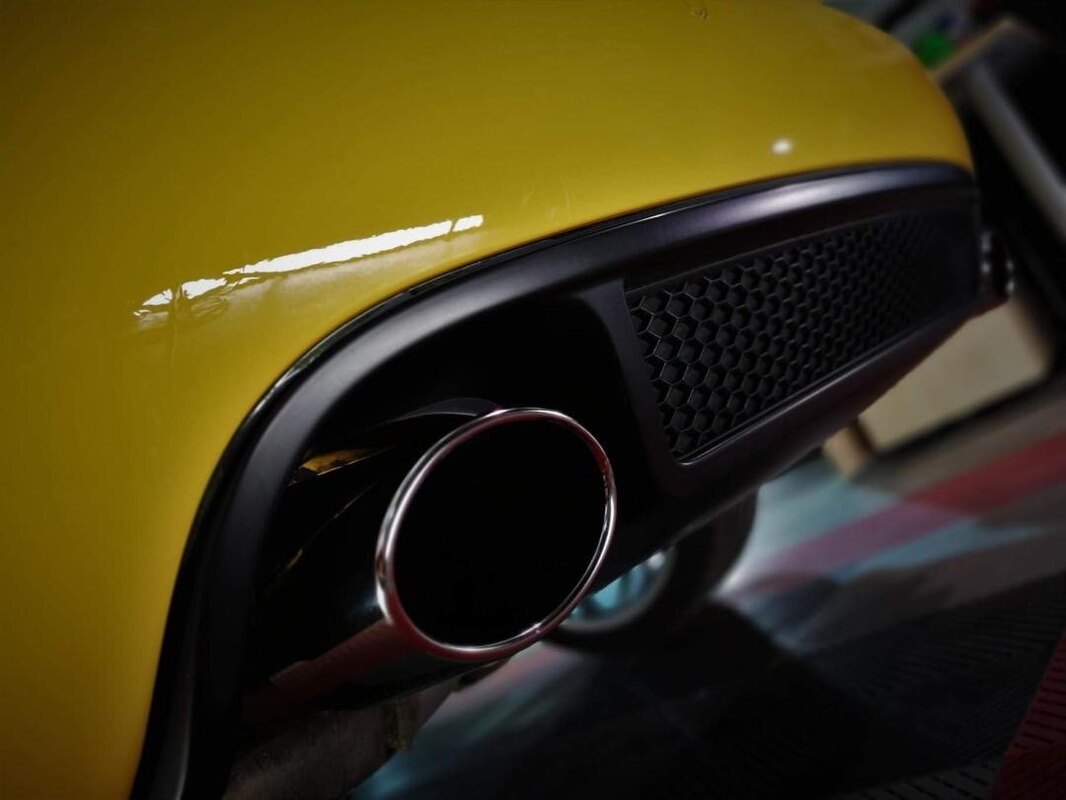 Les goûts et les couleurs étant ce qu’ils sont, je vais aborder un autre sujet : le « doux » son du V8. D’après l’historique fourni, les pré-catalyseurs ont été vidés et les catalyseurs supprimés. D’après les photos que j’ai prises, je suppose que l’élément central est un silencieux intermédiaire précédent les deux gamelles à clapet. Le son actuel est sympa mais je souhaiterais gagner encore quelques décibels (même avec la fonction « S ») sans avoir à passer par l’installation d’une ligne complète type Milltek, NTM, Capristo, JHM ou autre. Est-il possible de modifier ou remplacer l’élément qui semble être le silencieux central ? : Merci pour vos retours. Les photos :
