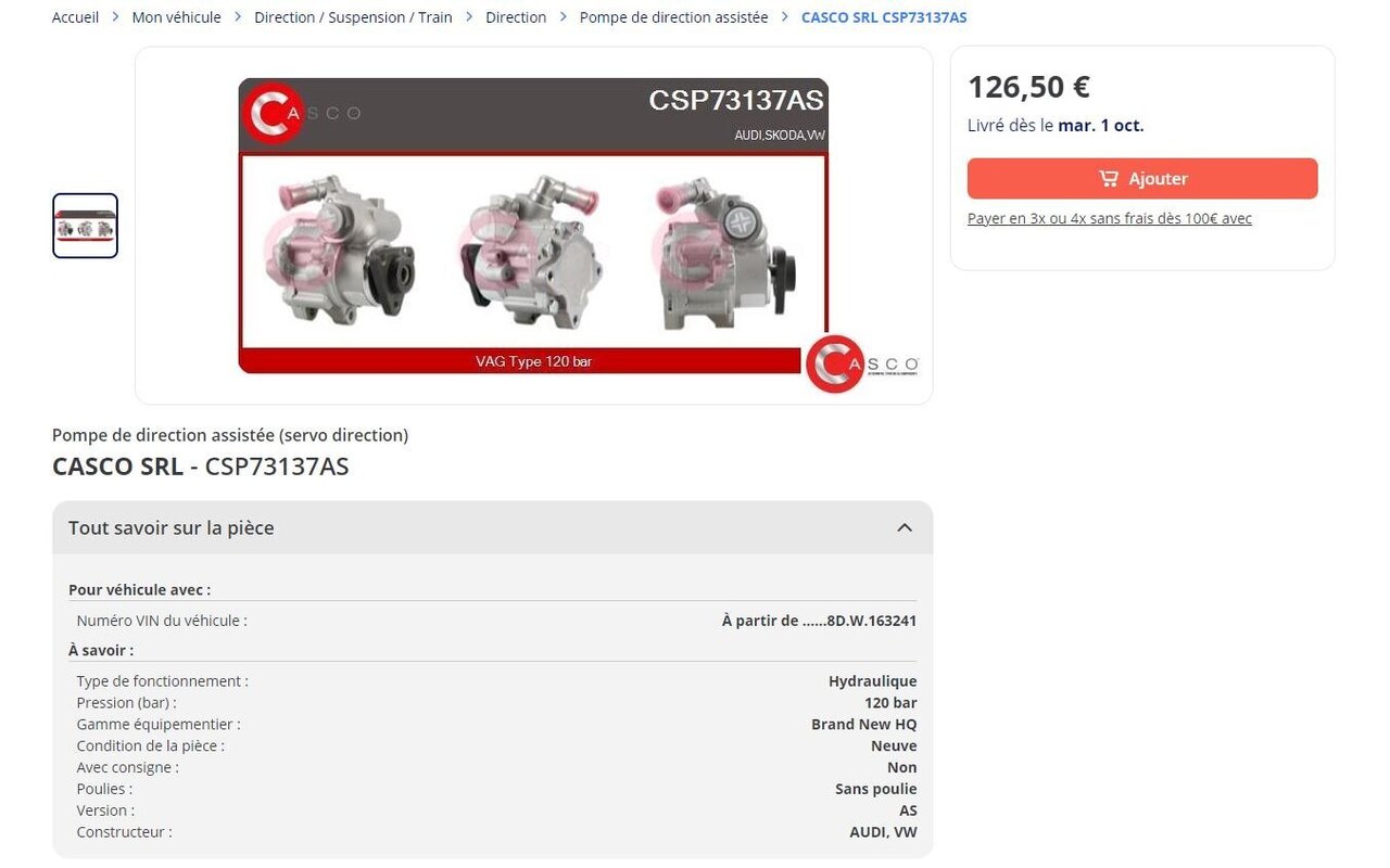 Bonjour, Ce matin je me suis attaqué au changement de la pompe hydraulique : Symptômes : bruit de roulement (semblable à celui d'un alternateur en fin de vie) qui suit le régime moteur ; très léger jeu au niveau de la poulie Etape 1 : trouver et commande la pompe adéquate (ou hydraulique pour eux qui préfèrent !) -