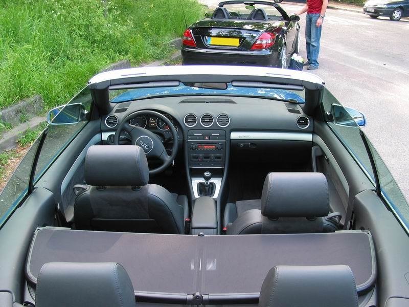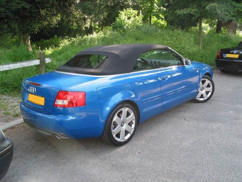 12. ATTENTION, Changement de voiture On la refait, moins crispé: - membre : Lelex pas changé ça... - année de fabrication : 2004 - voiture achetée neuve / d'occasion : occasion - modèle (A2, A3old, A3évo, A3new, S4, S4new, S3, S3évo,... ) : S4 Cabriolet - moteur (cylindrée et puissance): V8 4.2 344ch - préparation moteur (nom du préparateur / puissance obtenue) :N - berline / avant / cabrio,road : Cabriolet - version (ambiente, ambition, pack plus,...) : - boîte manuelle / automatique / DSG : Manuelle - traction / quattro : quattro - couleur extérieure : Bleu Sprint - couleur intérieure : noir - finition intérieure (tissu, cuir, cuir/alcantara,...): cuir/alcantara et inserts Alu - jantes (taille / dénomination): 18" AVUS - pneus (fabricant / modèle): Michelin PS2 - châssis modifié : N - freins modifiés : N - options / divers :