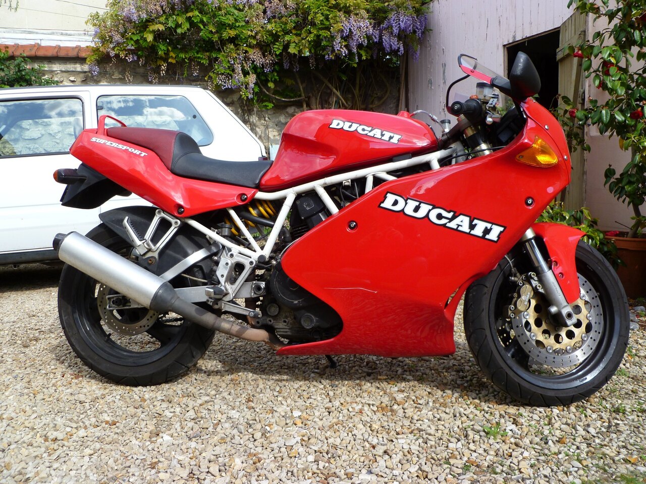 Ah oui mais faut pas faire ça en amateur. J'ai 30 ans d'expérience en la matière. Faut assurer son geste, taper dans un truc solide et le cas échéant pas cher ou déjà un peu nase. Sinon on casse du bois, on se blesse, c'est cher etc. Anecdote: il y a 20 piges je me suis acheté une Ducati Supersport 750. Celle du Joe Bar Team. 120 000 bornes, 1000 balles, sortie de grange. Elle ne roulait plus trop, les joints de queue de soupapes étaient secs. 120 000 bornes, je profite de l'hiver pour refaire le moulin. Je bosse d'arrache pied et tant qu'à faire, je change l'embrayage. Les 7 et demi ont l'embrayage en bain d'huile à partir de fin 91, j'avais une 92. Et comme un con, je prends le pack de disques dans l'emballage et je l'emmanche dans la cloche d'embrayoir, sans les tremper un par un. Après tout, c'est un embrayage en bain d'huile. Le dernier jour, je finis de la remonter à pas d'heure, je démarre tout guilleret, je la laisse chauffer pendant que je ferme l'atelier, je monte dessus, je débraye, je mets la première, j'embraye de 4 micros et pan, elle cale. "Merde, c'est raide quand neuf". Ca se reproduit 15 fois. Impossible de démarrer, un embrayage de F3000. L'huile ne peut pas pénétrer entre les disques, il faut les tremper un par un avant de les remonter. Et comme tous mes potes à l'atelier avaient des 900 ou des 750 avec l'embrayage à sec, personne n'a détecté que j'allais droit dans le mur. Furax, j'ai foutu un grand coup de poing sur le réservoir...que j'ai enfoncé. J'avais dès lors deux problèmes... Je suis rentré chez moi, piteux et j'ai repris l'embrayage le samedi suivant. J'ai laissé le réservoir enfoncé pendant des années comme un rappel "arrête d'être con". Les temps jadis, quand j'étais à des années lumières de regarder les A6 Allroad pour caser les vélos des mioches, ma 750SS et la Miata, daily la semaine, trackday le week end: Et puis les samedis avec du cambouis plein les ongles: Qu'est ce que je vais me faire chier si un jour j'ai un véhicule où il n'y a rien à faire... -