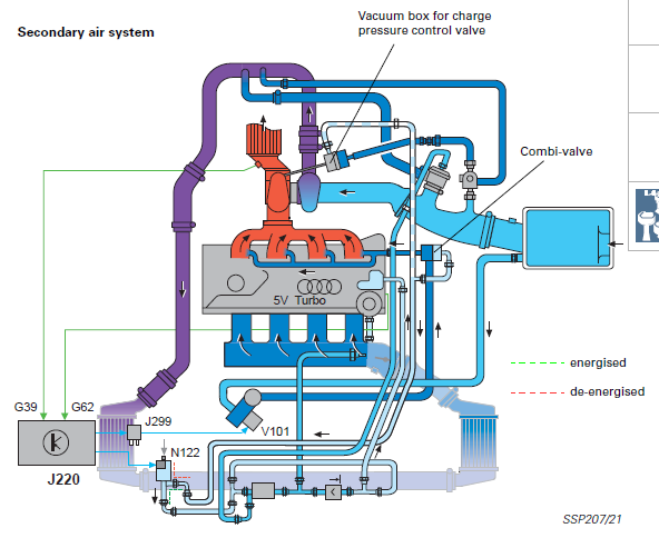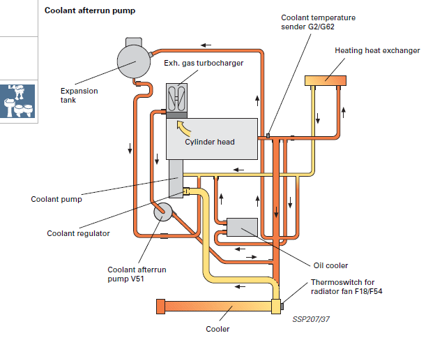 Je suis tombé sur un truc qui illustre ce que tu expliquais. Ces derniers jours j'ai potassé le Self Study Plan du TT qu'on peut trouver sur internet. J'y ai remarqué un truc marrant: la boucle de circulation en aval de la pompe turbo s'inverse suivant si le moteur (et donc la pompe à eau principale) tourne ou pas. Moteur en marche le LdR qui sort de la pompe turbo se fait embarquer dans le flux qui sort de la culasse et tout ce petit monde part vers le radiateur: Moteur coupé, le flux qui sort de la pompe turbo repart vers la culasse (donc à l'opposé de ce qu'il faisait moteur tournant), refroidit la culasse puis le turbo puis revient. Je pense qu'au passage il se fait diluer par tout le LdR des branches inertes alentour, ce qui améliore le refroidissement de ce qu'il y a à refroidir. Dimanche j'ai fait un test: 98°C canal 49, j'ai coupé le contact. Pompe turbo tournante, j'ai perdu des degrés, en gros un toutes les 30s. J'ai débranché la pompe, la température a augmenté d'un degré toutes les 30s, jusqu'à atteindre 104°C. En rebranchant la pompe la température a redégringolé à 98°C en quelques secondes. Tout bonnement parce que pompe coupée le canal 49 mesurait la chaleur qui diffusait de la culasse et, pompe tournante, le canal 49 mesurait la température qui revenait des zones déjà en train de refroidir. Toujours en lisant la Self Study Plan, j'ai pigé pourquoi les températures culasse s'étaient emballées pile après avoir rebranché la pompe à air secondaire. Tout simplement parce que cette bourrique a rempli son rôle: balancer de l'air à l'échappement pour doper les températures et accélérer l'amorçage cata. Le hic, c'est qu'elle balance cet air frais dans la culasse, ce qui dope les températures dès la culasse. Combiné à une pompe turbo qui fonctionne quand elle a envie, ça donne des températures nettement supérieures à ce que j'avais avant de rebrancher cette connerie de pompe. Désormais je lui ai coupé le sifflet, bon débarras. On verra demain matin si ma théorie se vérifie ou si je me fais encore un trajet de l'angoisse. -