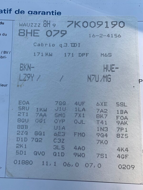 j'ai trouvé cette page concernant les fameux PR codes entre parenthèses : Liste des codes PR (options) Audi (Page 1) / Un brin de causette / Forum-audi.com je vais me pencher dessus , vérifier si je trouve pas la fameuse étiquette quelque part pour m'accorder aux valeurs . Actuellement mon module ABS indique ceci en menu , ligne adaptation pas dispo : -