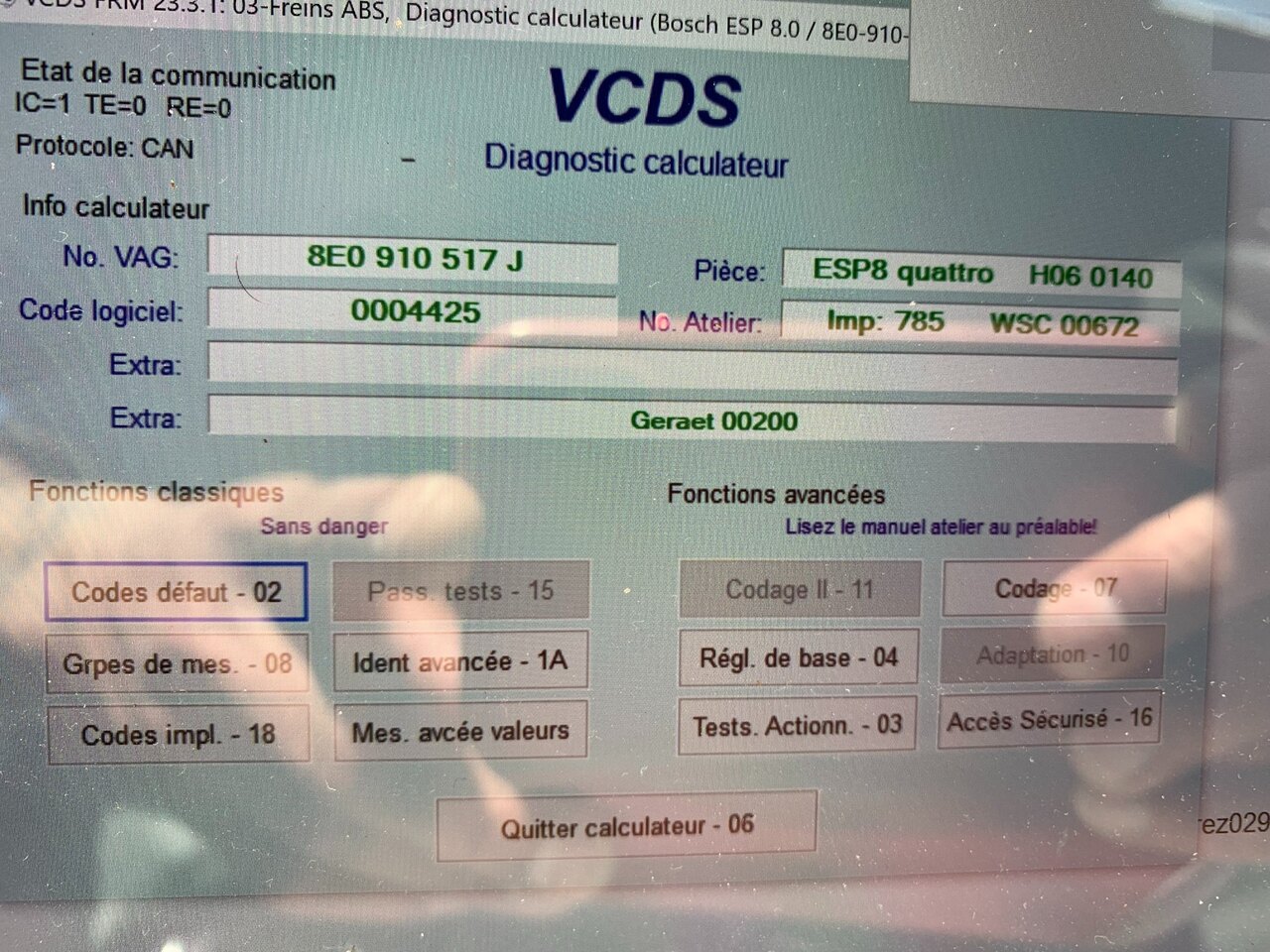 Salut, Pour essayer pas à pas de résoudre ce soucis , je vais poser des questions que j'espère utiles : -mon codage ABS: Pièce: ESP8 quattro H06 0140 Révision: 00000000 No. de série: 00000000000000 Codage: 0004425 semble t il correct? Comment sont déterminés les chiffres qui constituent ce codage , pour vérifier qu'ils sont adaptés au véhicule ? Merci d'avance -