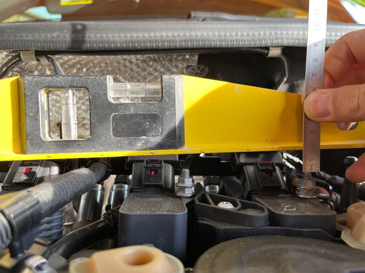 En complément, voici une photo prise avec un niveau à bulle posé sur la vis de masse de la bobine du premier cylindre côté distribution afin de comparer avec la vis du 4e cylindre côté boîte. Je précise que la bulle était centrée en posant le niveau sur la calandre ou au niveau du parebrise. -