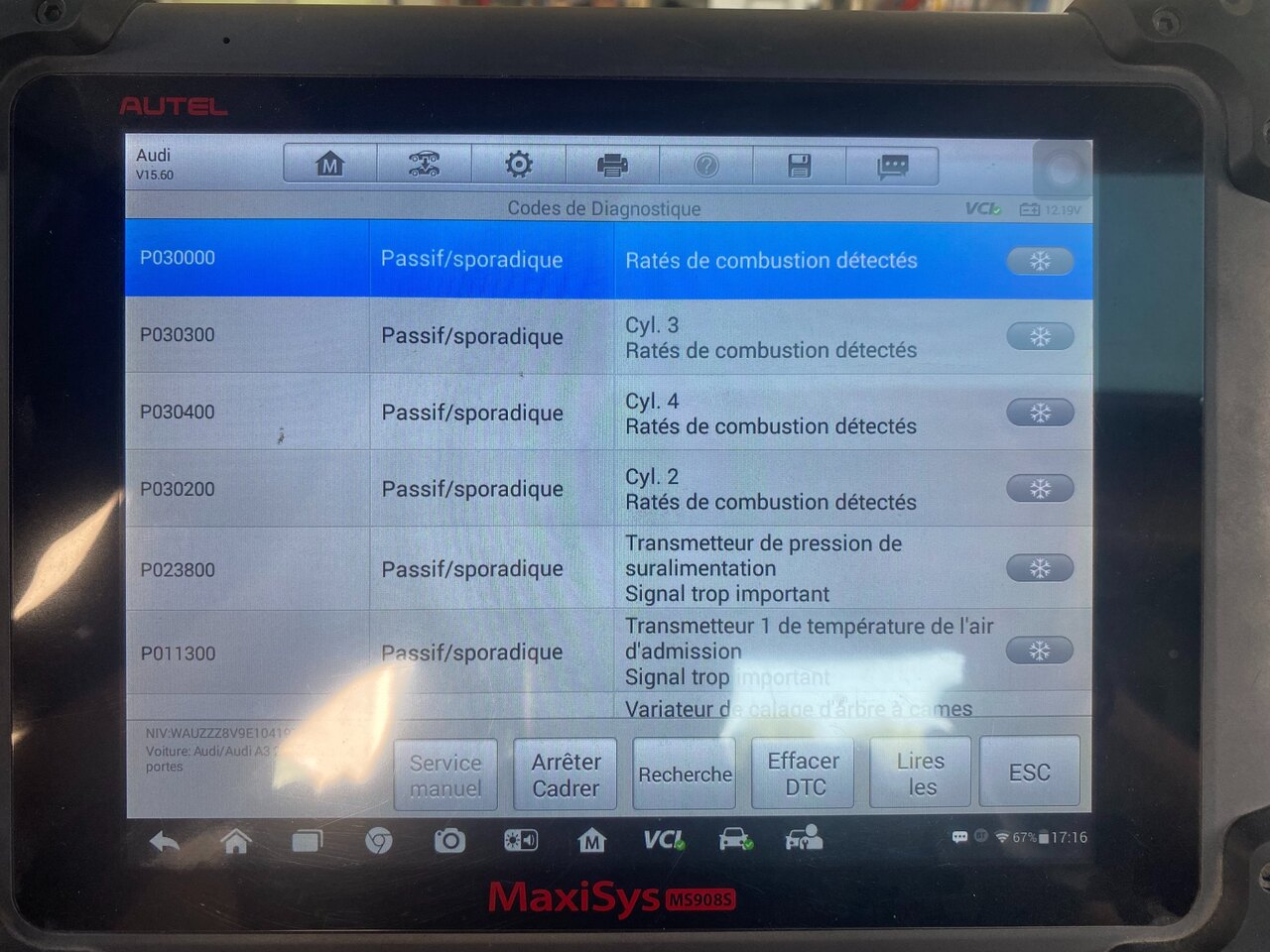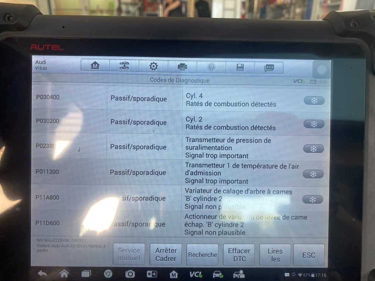 1. Bonjour a tous. Proprietaire d'une Audi A3 sedan 1.4 TFSI 140cv S-tronic 7 de 2014,je viens vers vous car j ai un probleme depuis 2/3 mois .. Depuis quelques temp j'ai un voyant epc qui s affiche au demarage suivi d un mode degradé puis apres l arret du vehicule pendant quelques heures plus rien le vehicule roule normalement . suite a cela je l emmene dans un garage specialisé dans la marque qui me dis qu ils hesitent entre un capteur ou l arbre a cames .. et que pour le moment il faut que je roule avec le vehicule et que je revienne lorsque celui ci me remettra les default. j ai donc rouler avec et au bout d un bon mois le voyant reapparait toujours accompagné du mode et degrader avec en plus un voyant moteur, etant au mois d aout et le garage etant fermé je vais chez un ami qui possede une valise et voici ce qu il en ressort:(voir photos) Pouvez vous me dire si quelqu un a deja eu ce probleme ou me donner des pistes a ce sujet. merci d avance