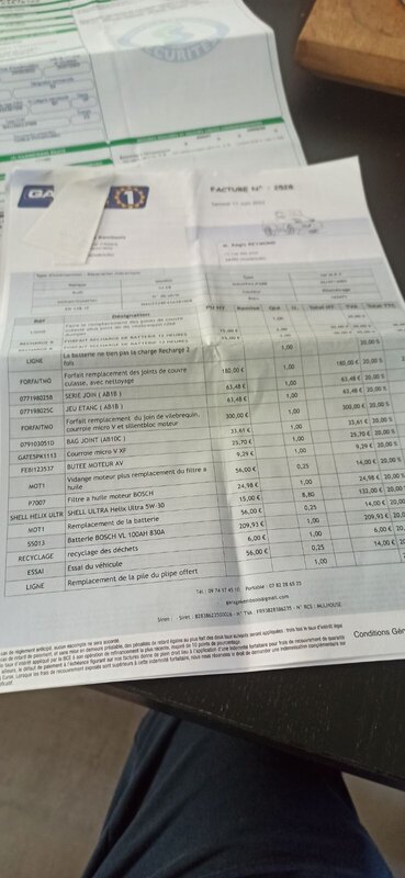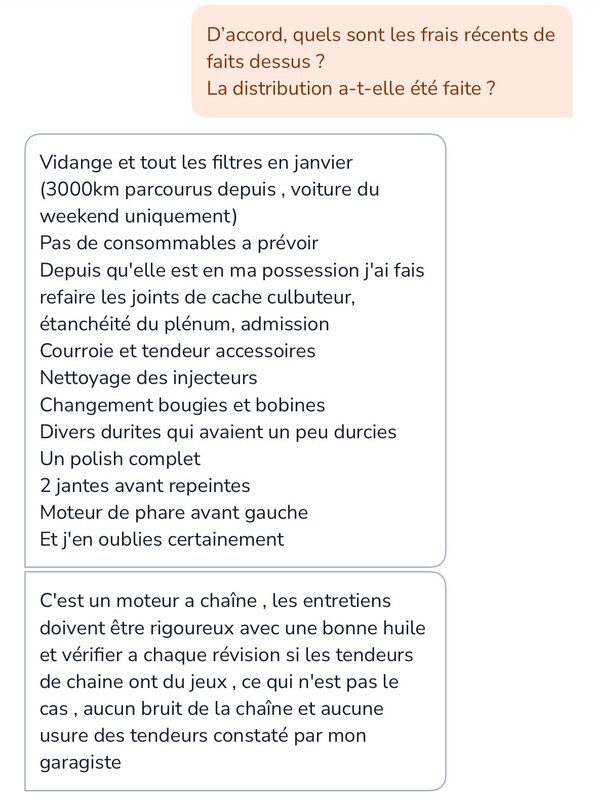 Salut Blasterworm, Merci pour les précisions, ça m’aide à progresser dans mon « enquête ». J’ai des screens de la conversation ainsi que les factures correspondantes ci-dessous. Le vendeur me dit qu’en démontant la boîte pour changer les joints spy son garagiste avait probablement un accès pour voir les galets. Je ne pense pas qu’il soit malhonnête mais je me méfie beaucoup. J’ai pas trop envie de tomber en panne en la ramenant. Il me certifie qu’il n’y a aucun bruit suspect, que ce soit à chaud ou à froid ( ce que je prendrai soin d’écouter ). Concernant le prix du véhicule, je le toucherais à 11.000€. Mis à part ce côté distribution, tout a été fait. Il a aussi effectué un polish complet, le carnet d’entretien est complet et à jour depuis le début, il a les factures avec… Je ne sais pas trop quoi penser. -