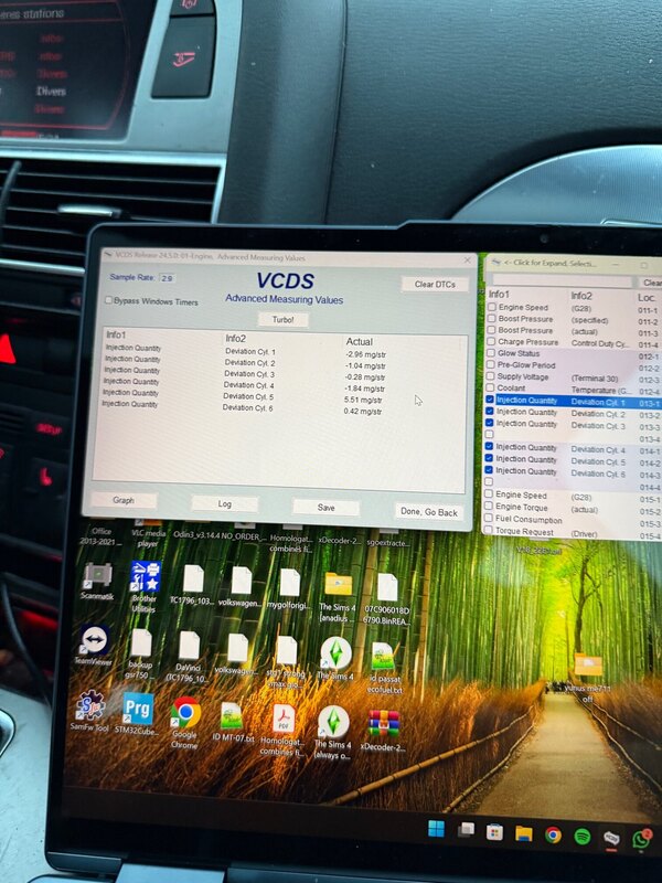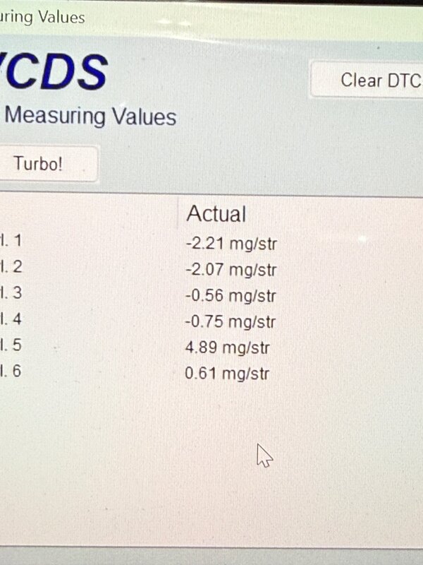 1. Bonjour à tous, et belle année! je pose mon problème ici en espérant qu’un de vous a déjà connu ça. Sur ma A6 3.0 TDI c6 que je viens d’acheter le moteur a commencé à trembler lors des accélération comme si elle tournait sur 5 cylindres. je précis qu’il n’y as aucun code erreur j’ai relevé les valeurs des 6 injecteurs en constatant une grosse différence sur le 5 Après remplacement des 6 injecteurs neuf elle tournait mieux mais toujours ces ratée de combustion. j’ai repris les valeurs injecteurs après remplacement et codage et j’obtiens toujune valeur différente sur le 5. je ne sais pas si c’est valeurs sont normales, et si il y a un rapport avec ce tremblement raté ou rien à voir. première photo avant remplacement des injecteurs, deuxième photo après remplacement des injecteurs avec régime autour des 2000trs