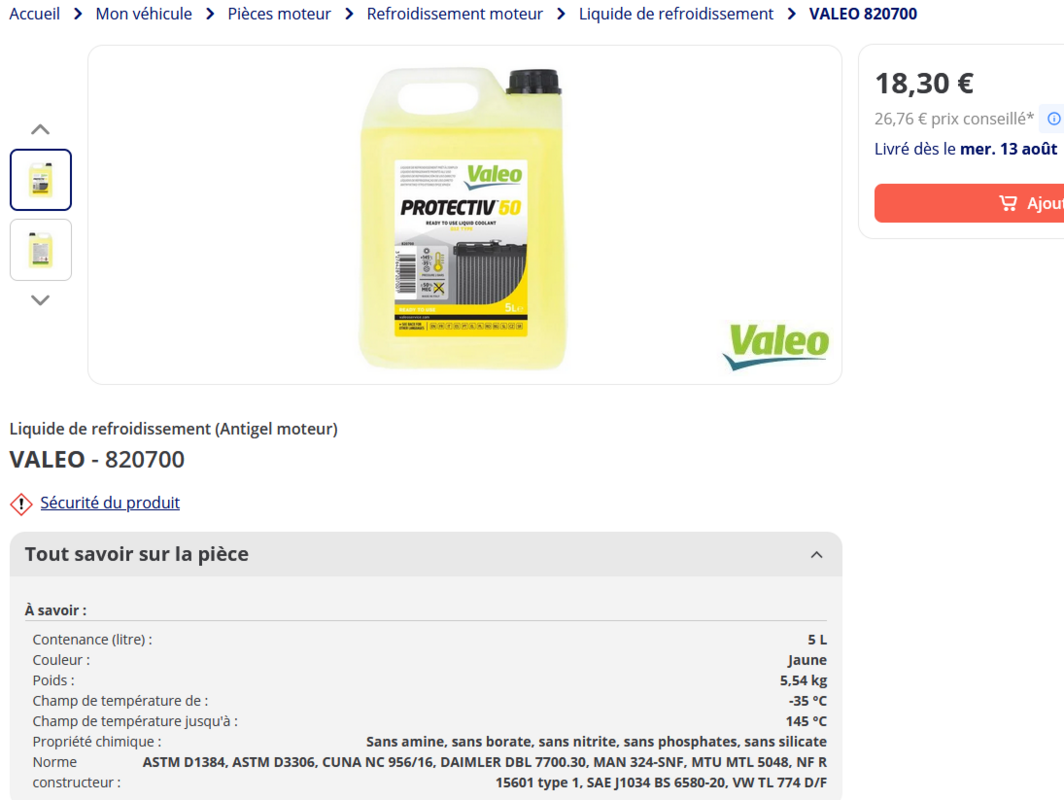 "Petit" deterrage... Vues les temperatures élévées en ce moment, je me suis penché sur la recherche d'un bidon de liquide de refroidissement pour mon RS Q3. (sa doc indique norme TL 774 G pour le G12++ et TL 774 J pour le G13.) Voici la fiche sécurité du Protective 50 de Valéo annoncé en pret à l'emploi G12, G12++ et G13 : Sur le site Oscaro, il est bien annoncé compatible avec mon Q3 Idem avec la version rose que j'ai commandée sur la boutique Valéo d'Amazon, bien annoncée compatible avec la voiture. Serge.
