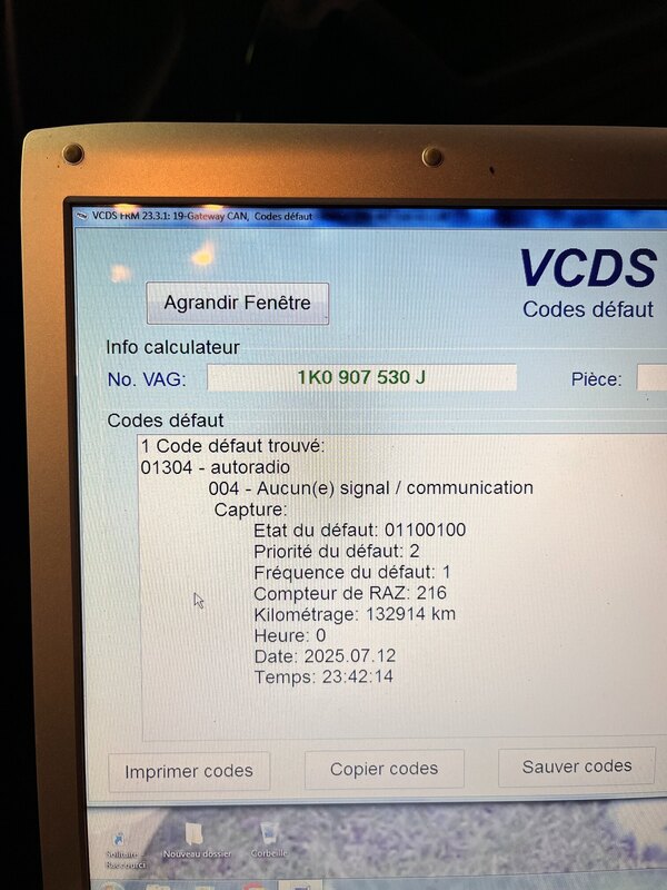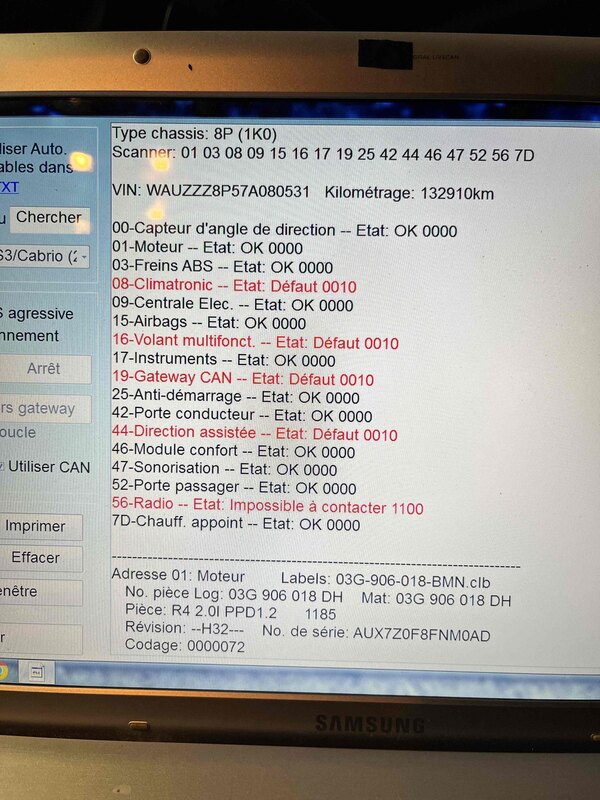 Bonjour. Comme précisé dans ma présentation, j'ai un garage auto spécialisé dans les voitures anciennes. Là je commence à découvrir l'univers de l'électronique auto et du diag. J'ai acheté une audi a3 8p 2.0 tdi 170 132 000 kms en procédure RSV. Choc avant droit : triangle et cardan à remplacer. Certainement un trottoir ou gros nid de poule. Très peu de dégâts pour un véhicule qui a fini à la casse...... Pas de déclenchement d'airbag. La mécanique a été faite. J'ai monté une batterie neuve varta 77ah 780a car la voiture était stockée depuis 6 mois. Un pote m'a prêté un vag diag avec vcds. Mais il s'agit d'une version ancienne qui n'est plus à jour. Officielle ou chinoise, je ne sais pas. Il y a pas de calculateurs auxquels je ne parviens pas à accéder. C'est la même lorsque j'ai essayé sur mon a3 8l 1.9 TDI. Peut être que le logiciel est dans les choux. Les problème sont le suivants : - quand je tourne la clé le moteur est entrainé mais ne démarre pas. - un pb de capteur G85. Certainement à remplacer/recalibrer vu le choc avant droit. - soucis d'autoradio (mais ça on verra plus tard). J'ai contrôlé la pression de carburant en arrivée de filtre : le gazole arrive. Voilà deux photos : - le compteur lorsque je viens de mettre le contact - l'autoscan Pouvez vous me dire la procédure à suivre. Cordialement. Arnaud.