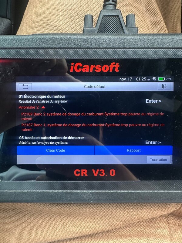 Elle l’avais mise un voyant moteur quand je roulais tranquillement, je me suis arrêter j’ai passer un coup de valise j’ai effacer les deux code défauts mais au bout d’un moment il revienne, par contre le voyant moteur lui n’est apparu que 2 fois, mais lui le ralenti est toujours instable. Quand je démarre à froid je constate un bruit comme une fuite dans le capot ça souffle et à chaud ça diminue et on l’entend plus après. Quand j’ouvre le bouchon d’huile j’ai une très forte aspiration au point que je galère à décollé le bouchon, j’ai pensé à une valve PCV percé.