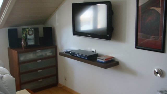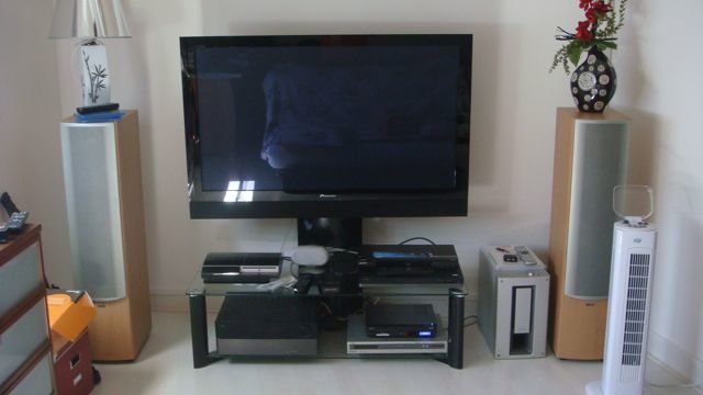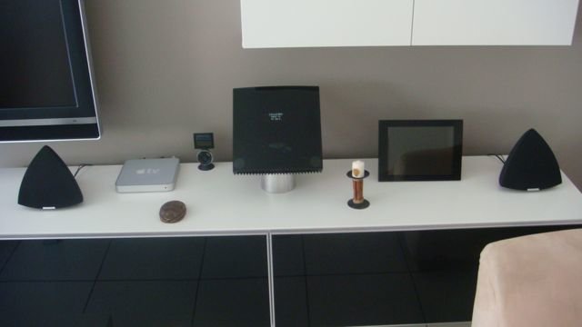 Salut Je viens de finir de demenager, j'en ai profité pour integrer l'installation au maximum Installation dans le salon (stereo) Sony LCD 40" Ensemble Bang&Olufsen Apple TV Telecommande Beo5 tactile (que je dois encore programmer) Dans le meuble, bluRay US + DVDScope + Decodeur C+ L'eclairage est commandable avec les telecommandes B&O Dans la chambre des parents Chaine B&O avec borne Apple Express pour streaming MP3 LCD Samsung 32" Bluray Decodeur TNTSat à venir Dans l'espace HomeCinema Plasma Pionner 50", ampli et DVD HarmanKardon, bluray US PS3 et DVDscope Sony, Decodeur TNTSat. Enceintes Infinity. La piece est en 7.1 avec mon ancien kit 5.1 sony dont on peut voir l'enceinte centrale et le caisson de basse Je compte passer à l'occasion à la video projection, le plasma descndra au salon remplacer le LCD Sony. La partie Media Center : iMac 24" avec 2x1To de stockage Les achats de matos B&O ont tous été fait d'occaz sur ebay.de. Economie de 40 à 50 % sur les modeles neufs. Christophe Voici la photo de la partie HomeCinema -