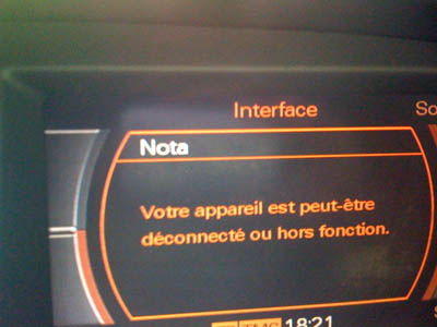 9. Bonjour à tous, J'ai acheté l'AMI, le cable en Y pour faire un pont optique et alimentation sur les conseils de Nicodep, assez simple à mettre en place. Decoupag de la boite à gant avec une scie toute simple. Cout total de l'install AMI :310E + Cable Y 40 EUROS + 2 cables AUdi 75E soit 425 Euros TTC MAIS ! L'AMI est bien detecté car j'etais deja en version 5150 du MMI, mais malheureusement un message m'indique : Appareil deconnecté ou hors fonction dans l'ODB et sur l'ecran MMI avez vous une solution ou rencontrer un pb de ce type ? Merci