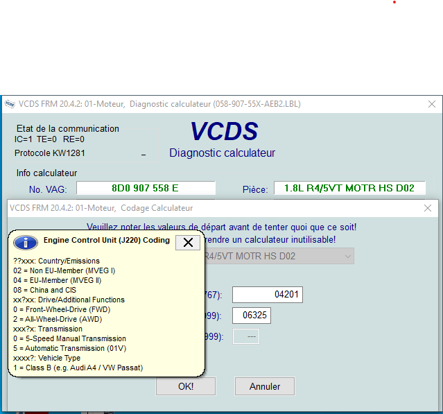 Salut, Sur mon A4 B5, moteur 1.8TQ (AEB), j'ai remplacé l'ECU car celui qui était dedans avait été modifié (on voit qu'il a été remplacé). Je me suis donc lancé avec cette procédure. Tout a bien fonctionné sauf le codage du calculateur : sur l'ancien, il y avait 04201, alors que le nouveau a 04001. La différence concerne la transmission (0 pour traction, 2 pour quattro). Ayant une quattro, je dois mettre 04201, mais lorsque je vais dans "Codage - 07", je modifie la valeur et je clique sur "OK!", la valeur n'est pas enregistrée. Faut-il préalablement aller dans "Accès - 11" et entrer un code qui autorise la modification ? Si oui, quel est ce code ? J'ai essayé avec le code immo (code PIN) ça ne l'a pas pris. Quelle(s) incidence(s) si je le laisse déclaré en traction (avec un 0 au lieu du 2) ?
