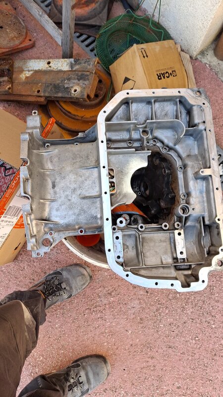 Salut, Bon, j'ai bossé sur la voiture, c'est une belle galère... Pour commencer, j'ai réussi à démonter le carter d'huile. Il faut taper dessus avec un maillet, un peu de tous les côtés, et il est venu assez facilement. À l'intérieur, c'est assez propre. Je n'ai pas pris de photo de l'intérieur du carter, lui était bien encrassé par l'huile, Du coup, il a eu droit à un bon coup de nettoyage au nettoyant frein, il est comme neuf (désolé je n'ai pas pris de photo). J'ai ensuite démonté les poulies, tendeur et toutes les vis qui tiennent la flasque que je dois remplacer. Ça ne suffit pas pour la sortir : j'ai dû démonter le support de pompe DA / clim pour dégager un tout petit angle de la flasque (pour cela il faut démonter la pompe de DA, ensuite les 3 vis inaccessibles qui tiennent le support, les 2 durites du radiateur d'huile). Et ça ne suffit toujours pas : il faut démonter la pompe à huile (merci aux 2 sujets qui ont été traités ici et là pour les infos), mais aussi le reste de carter inférieur, car il y a une petite boursoufflure à l'intérieur de la flasque qui bloque l'extraction de la flasque entre le carter et le vilebrequin Du coup, il faut dévisser les supports moteur, lever le moteur pour accéder aux vis entre le carter et le moteur, mais également le bas de la boite et le démarreur qui sont fixés sur ce carter !!! Oui, il y a tout ça à faire juste pour cette petite flasque !!! Photo de la face avant ce soir : J'ai quand-même nettoyé le moteur (du moins là où je travaillais) parce qu'il est bien gras. J'ai aussi sablé la "nouvelle" flasque pour que ça fasse propre Avant : après Bon, voilà pour aujourd'hui. Demain, j'essaye de finir le démontage, nettoyage, et remontage... -