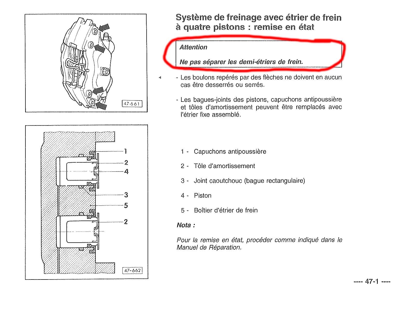 Moi je suis un bricoleur Mais un bricoleur qui sait lire et là il est ecrit: ATTENTION ne pas séparer les demi-etriers de frein, les boulons repérés par des flèches ne doivent EN AUCUN CAS etre desseres ou serres. au fait donne nous le couple de serrage de ces vis ? -