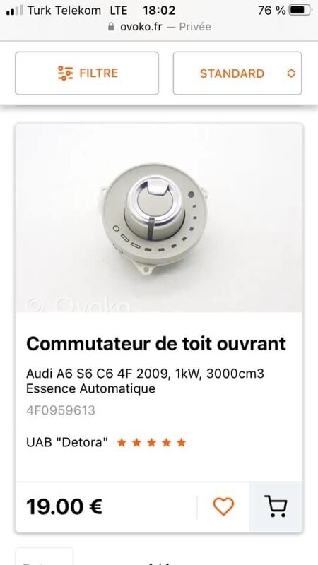 Le tarif en vrai je sais pas car j’ai eu un lot de pièces pour 180€ je crois (5 feux, des trapes carénages de coffre, les éclaireurs) et du coup j’ai revendu les feux et racheté des neufs 😂 Mais faut compter une 50aine d’€ de ce que j’ai vue. Voici la réf du plafonnier avant (d’ailleurs il m’en reste 1 de mémoire mais pas complet je crois) la réf du bouton phase 2 la réf du plafonnier arrière -
