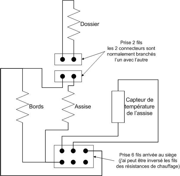 Bon, j'ai testé aussi le démontage du siège : problème de résistance chauffante semble-t-il. Tout d'abord, le schéma électrique du circuit : La grosse prise à 6 connecteurs sert à raccorder le siège au faisceau qui sort de la moquette. L'autre prise permet de raccorder la résistance chauffante du dossier au reste du circuit. En débranchant les 2 prise, on peut tester à l'ohmmètre la résistance de chacun des éléments chauffants : - entre les connecteurs 3 et 4 de la grosse prise, on mesure la résistance de chauffe des bords - le dossier se teste directement entre les 2 prises du connecteur - le siège est mesuré en prenant un connecteur de la grosse prise et un de la petite (les bons, j'ai peut etre inversé !) Bilan pour moi : la résistance du siège est infinie => élément HS. J'irai plus loin quand je changerai l'élément chauffant (renseignements pris, il semble qu'il faille coller une espèce de feuille chauffante entre la mousse et le cuir, par dessus l'ancienne) -