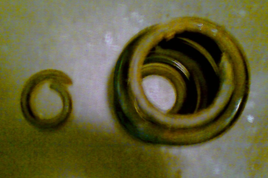 Très clair : je viens de finir. Comme j'avais des pinces pour compresser les ressorts, j'ai d'abord compressé le ressort (pas trop, juste pour qu'il n'appuie pas sur les rondelles en caoutchouc) Ensuite, j'ai soulevé le bout du bras, là où se trouve le disque de frein (juste quelques cm), dévissé le boulon de l'amortisseur, redescendu le bras : il redescend suffisement bas pour qu'on puisse enlever le ressort. Ensuite, opérations inverses pour le remontage. Total (une fois que j'ai su comment faire) : une bonne heure et me voilà avec un ressort neuf, et surtout non cassé ! (pour info, voilà à quoi ressemblait mon vieux ressort : -