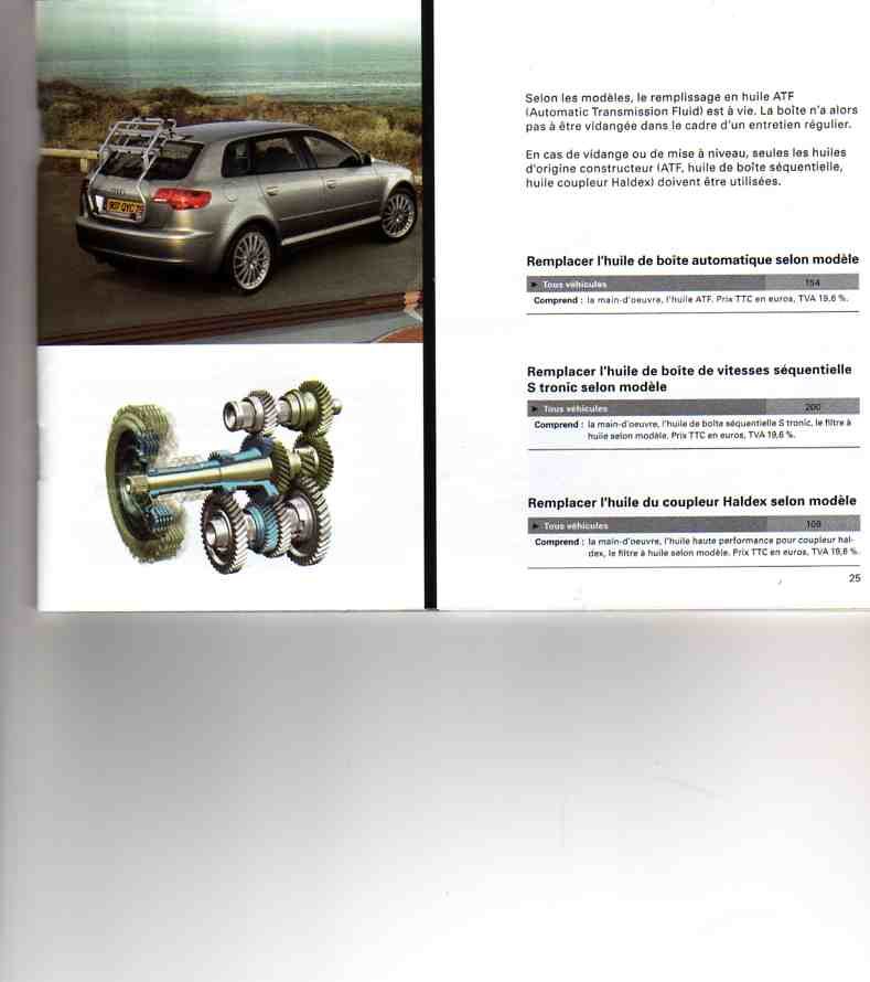 bonjour, je pense que je ne vous apporterais pas grand chose mais voilà ce que j'ai recu d'audi début janvier dans le "forfait entretiens révisions 2008" (pièce jointe) mon véhicule a 89000 kms je dois passer en entretien dans quelques jours et je demande ce que je dois faire quand je lis les préconisations audi et vos avis maintenant je ne comprends pas pourquoi avec une garantie (ce qui est mon cas) jusqu'en mars 2009, j'aurais environ 110/115 000 kms audi prends des risques de devoir remplacer une boite auto à ses frais!!!! -