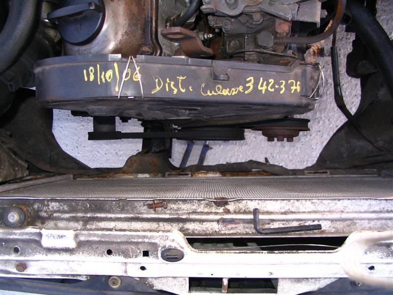 Comme prévu, je me suis lancé dans mes travaux samedi. Mon but : tomber le carter, puis la pompe pour découvrir une éventuelle cause de mon problème de pression au démarrage, comme par exemple, la valve de surpression bloquée en position ouverte. Malheureusement, après plusieurs heures, j'ai abandonné, à 1 cm du but. Je ne suis pas parvenu à dégager le carter, en levant le moteur avec mon cric, comme je l'avais fait il y a 4 ans. Je peux vous dire que ça a miné le restant de mon samedi car je n'aime pas rester sur ce genre d'échec. Mais que voulez-vous... Je peux quand même pas me permettre de négliger ma petite famille indéfiniment pour ce tas de ferraille (-> pointe de rancœur à peine dissimulée). La première fois que j'avais réalisé cette opération, j'étais pourtant parvenu à lever le moteur avec 2 crics. Alors c'était la bonne débrouille, tout ce qu'il y a de plus inconscient : un cric hydraulique sous le support moteur droit et le cric de secours pour le gauche, en prenant appui sur la caisse (un truc de fou). Mais j'y étais arrivé ! Ce coup-ci, je sais pas... un peu moins de confiance en moi, un peu plus de maturité sans doute, j'ai pas osé : je me suis vu mourir écrasé en voyant le peu de prise que j'avais avec mon malheureux cric de secours. Donc j'ai décidé de reporter ma tentative le jour où j'aurai l'occasion de me procurer une grue pour moteur ou un système de levage digne de ce nom. Bref, j'ai tout remonté et j'ai mis, comme on me l'avait recommandé, une huile 10W40 de marque Kroon. Résultat : pareil qu'avant, exactement. Mais bon, allez, histoire de ne pas avoir fait ça pour rien, je laisse place aux étapes avec photos (les bonus, c'est à la fin). 1) Vue d'ensemble d'un 1.6 TD de '89, le même que sur les Golf de l'époque. 2) Vue par dessus, derrière le radiateur du moteur (duquel j'ai retiré les ventilos pour plus de visibilité : on voit le silenbloc moteur avant, juste sous le radiateur, (2 vis qu'il faut démonter à l'aide d'une clé allen coudé)