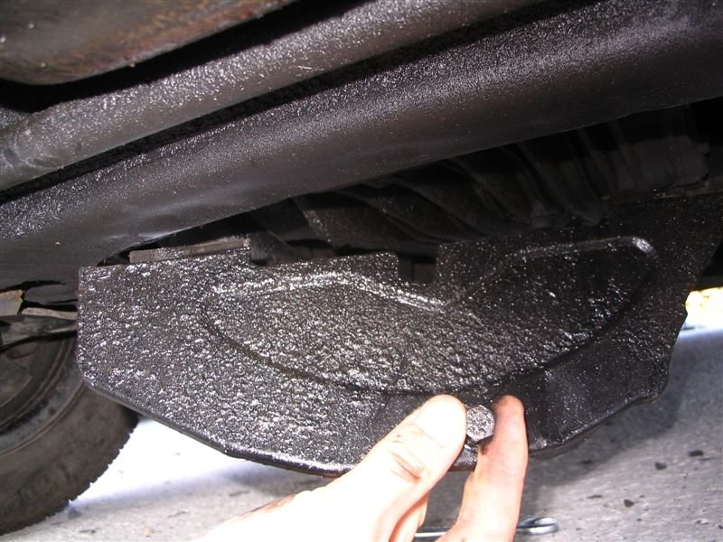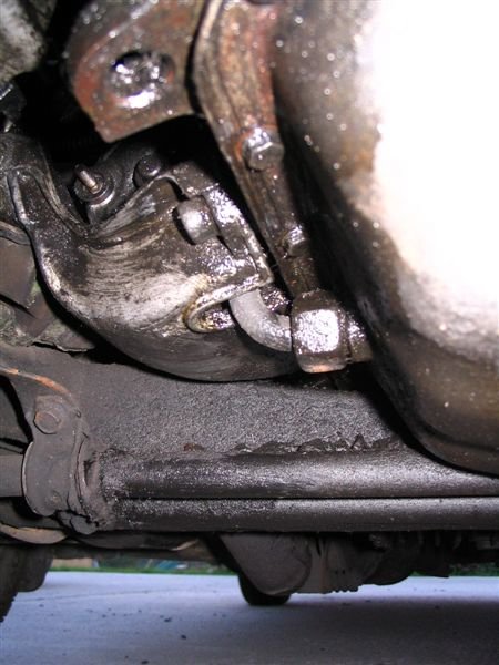4) Le carter d'huile (belle couleur !) : je ne vous explique pas comment on fait une vidange. Mais on voit le silenbloc moteur côté gauche (en vert, lien entre la caisse et le support moteur. Il faut le dévisser côté moteur comme côté caisse pour être à l'aise ensuite : c'est là que j'avais placé mon cric embarqué jadis pour gagner LE cm décisif :blink: Evidemment, il faut faire de même avec le silenbloc, côté gauche.