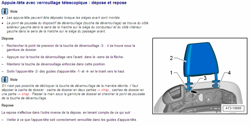 Salut jeanfi38 ! :coucou: Pour demonter les appuis tete audi nouvelle génération il faut connaitre le schéma interne ci dessous : Le plus simple c'est de s'y mettre à 2 :blink: :blink: ......Un appuie sur la touche de déverouillage '3' , tandis que l'autre tire l'appui tete vers le haut! Note que la fameuse touche de déverouillage '3' n'est pas perceptible au touché à travers le siège ! :unsure: Bon demontage ! :bien: -
