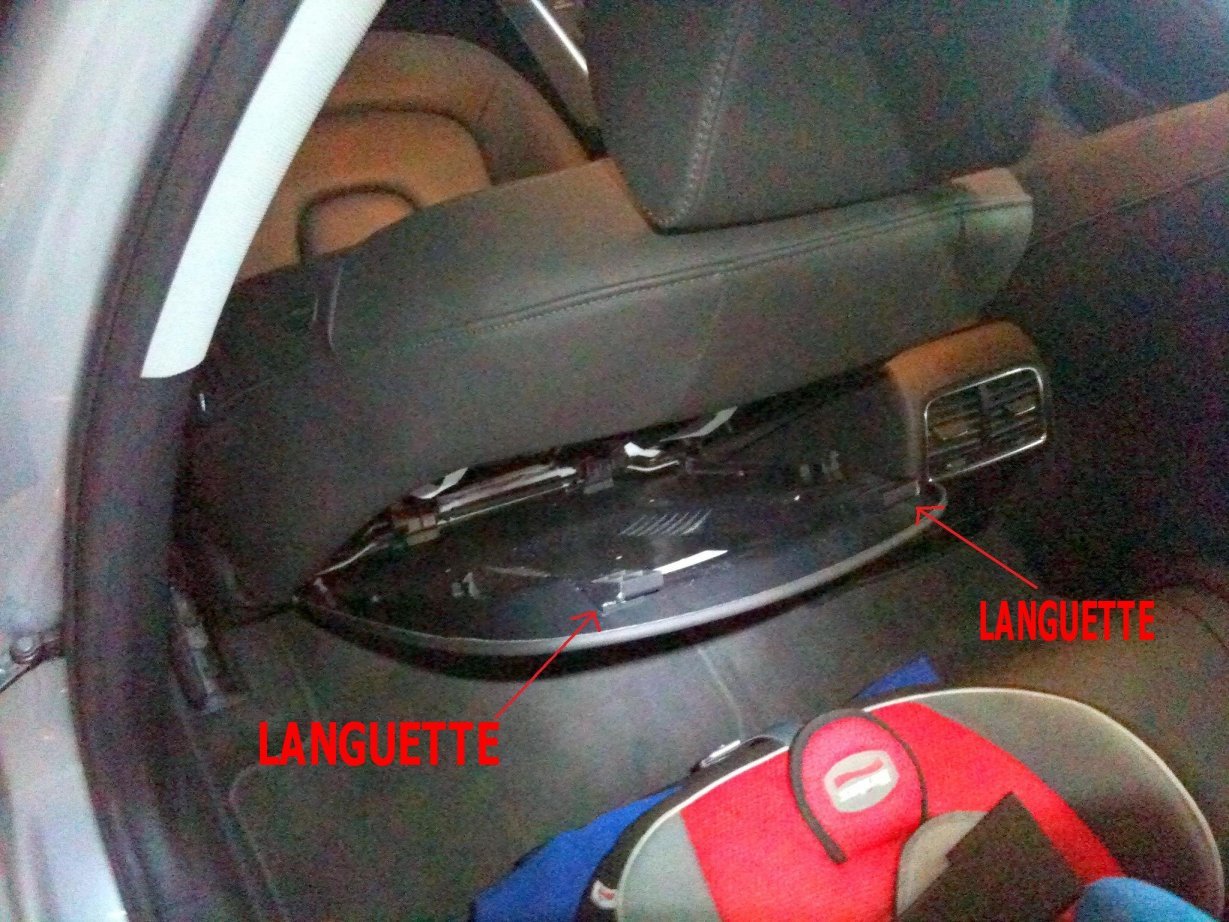 Salut SPRIOUX! Lorsque j'ai demonté l'arrière des sièges de ma A4 (sièges identiques à l'A5), je procedé par fléchissement de la partie haute de la face arrière : Il faut faire passer ses doigts entre le sièges (cuir) et la face arrière en haut (droite ou gauche) à l'aide d'un gros tournevis plat (faire attention de ne pas dechirer le cuir !)..attention , ça peut pincer fort ! Ensuite, il faut fortement tordre vers l'avant-bas de la voiture la face arrière afin faire descendre une des deux grosses languettes en haut de la face arrière. Une fois la première languette sortie, on fait pareil avec la seconde.....et pas de pièce à acheter chez audi pour remonter ...car pas de de déclipsage ! photos : -