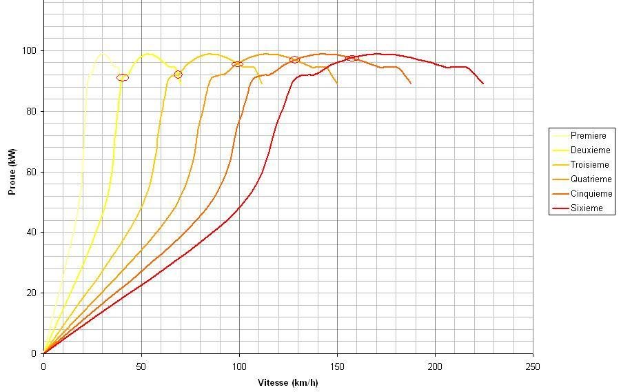 Exact... aucun interet d aller plus haut, si tu as ta courbe de puissance d'origine... apres 4000tr/min, y a deja plus rien. Pour aider a comprendre, voici les courbes de la puissance a la roue disponible sur chaque rapport pour mon A3 2.0TDI 136cv (Banc Bosch). Si on calcule ma puissance moteur, je suis deja a 148cv d'origine... Maintenant, grace a ces courbes tu sais a quelle vitesse du vehicule ou a quel regime il est optimum de changer la vitesse afin d'avoir le puissance a la roue maximum, donc ton acceleration maximum. J'ai encercle en rouge le point de changement. Dans mon cas: 39, 68, 99, 130, 155. Plus on grimpe dans les rapports, moins on doit ainsi aller vers la zone rouge. En 4, 5 , le regime optimum est 3800- 3900tr. Si tu insistes plus, tu ne gagnes plus de temps... ;-) Pour moi, si tu es amateur de haut regime, vaut mieux une TFSI en effet! +++ -