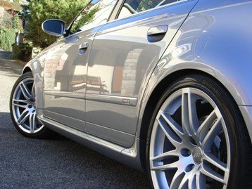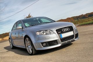 Merci à tous. Je trouve un peu de temps maintenant pour décrire la voiture et poster quelques photos. J'étais aujourd'hui chez Seba68 pour faire cirer mon nouveau bolide. Il maîtrise vraiment bien les techniques de nettoyage, lavage, polish, lustrage... Et il a du super matos de pro, sans parler de la fameuse cire miracle de chez Swisswax (la Concorso), l'une des meilleures du monde sinon la meilleure. Il a passé 3h30 à laver la voiture, décontaminer la carosserie, passer une pré cire et enfin poser la cire. Du travail de pro que je vous conseille vivement pour garder une carrosserie nickel comme neuve :bien: . Alors n'hésitez pas à le contacter sur le forum. Fermons la paranthèse et passons à la description de l'avion de chasse familial. - RS4 B7 berline de juillet 2007 - Véhicule de direction Audi AG avant d'être acheté par l'ancien propriétaire - Achetée à 37000 km jeudi dernier - Couleur gris Avus + pack alu mat - Jantes RS4 7 branches double gris - Châssis sport (pas de problème jusqu'à maintenant, touchons du bois!) - Intérieur noir, cuir Valcona - Pack intérieur carbone - Sièges baquets F1 chauffants, semi électrique avec soutien lombaire élec - Volant RS - Chargeur 6 CD - Alarme Audi - Rideaux pare soleil arrières (manuels sur vitres latérales arrières et élec sur lunette arrière) - Préparation téléphone sur console centrale: c'est vraiment moche; vivement que je le fasse enlevé. - Rétro dégivrants - Capteur de pression des pneus - Pack lumière - Equipement de série: GPS, système audio BOSE, aides au stationnement avant / arrière, régulateur de vitesse, trappe à ski, phares xénon... Cela correspond vraiment bien à ce que je recherchais. Voici quelques premières photos faites par mon pote Darktitix, un vrai pro de la photo :bigthumbup: . J'en posterai d'autres plus tard. En attendant, Enjoy :eldiablo: :eldiablo: -