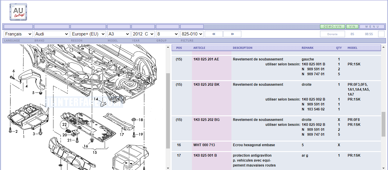 Il faut regarder les "PR codes" sur la droite. Ça correspond aux codes options ou équipements de série. Si tu consultes la liste, qui apparaît collée sur le logement de roue de secours ou dans les 1ères pages du manuel utilisateur et qui caractérise précisément ta voiture, il faut que tu retrouves les mêmes codes, que ce qui est affiché à droite. Sinon, un passage en concession et demander le devis en présentant son certificat d'immatriculation, ça marche très bien... -