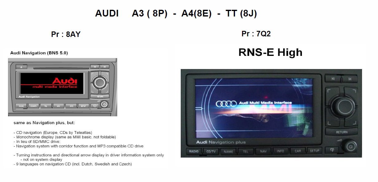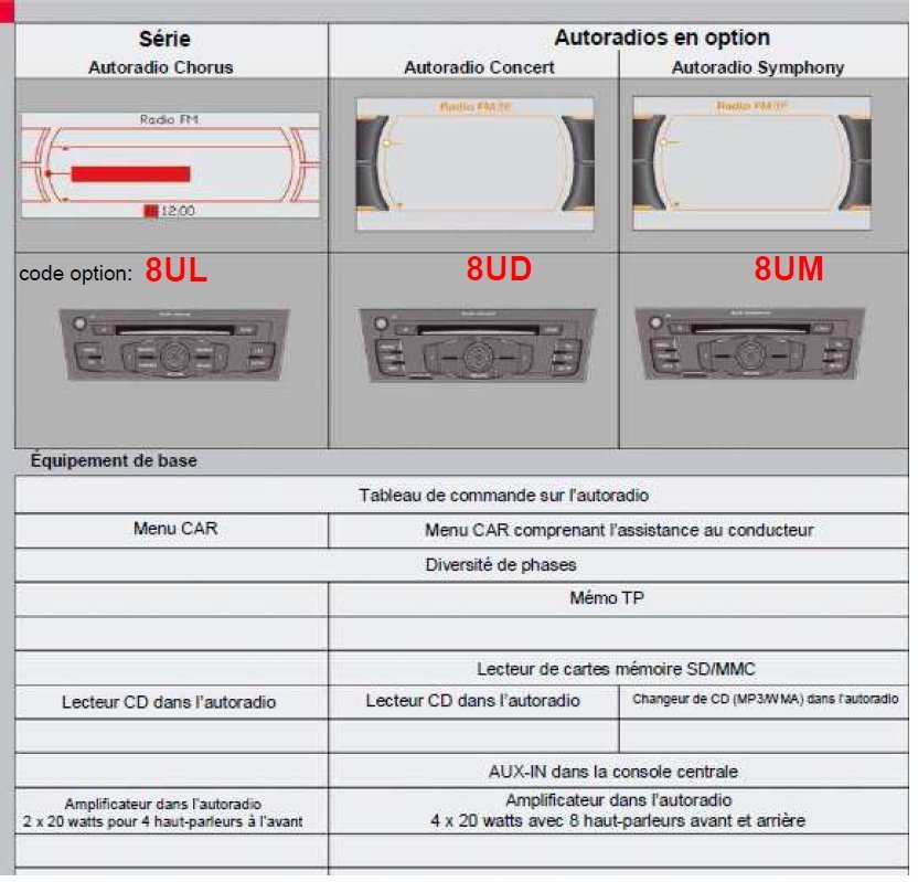 les radios qui fonctionnent avec la logique MMI( avec grand ecran) , les radios n'utilisent pas la technologie MOST ( fibre optique)mais il utilise la logique MMI ( même presentation , même menu...) sur : A4 , A5 , Q5 ( code option en rouge) -