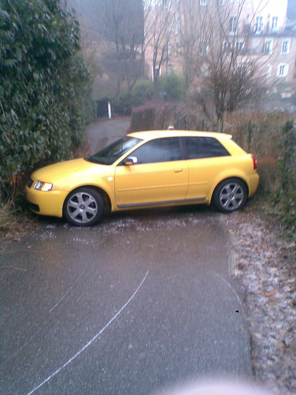 Salut à tous. Hier matin alors que je pars au travail tranquillement. Déja je chute en sortant de la voiture pour fermer le garage :furious: Ensuite j'ai la bonne idée de vouloir prendre un raccourci car je bosse pas tres loin de chez moi ce jour la (je suis ds le batiment donc je travail un peu partout ds la region). Ce raccourci c'est un chemin tres etroit et surtout avec une enorme montée, j'arrive donc en bas de cette montée avec deja des difficultes avant dans les descentes; obligé de remmetre la premiere car les freins sur la glace c'est meme pas la peine. je commence a monter puis au bout de 5-6m, la voiture est reparti en arriere !!! il y avait un virage j'ai donc essayé d'accelerer (j'ai rupté en 2) puis g braqué pour pas foncer droit derriere ds un poteau et la par miracle la voiture c'est arrété sans rien toucher :rolleyes: complètement perpendiculaire à la route avec 2cm derriere du grillage et l'avant un peu ds le buisson mais sans degat. je vous joint une photo parce que jy croyais pas. on voit pas bien la pente sur la photo mais c'est vraiment très raide plus haut la ou j'ai commencé à glisser. j'ai ensuite demander au riverains du sel et j'ai du couper un peu le buisson pour ne pas rayé tout l'avant mais j'ai réussi. incroyable coup de chance. Dsl j'arrive pas à mettre la photo en plus grand