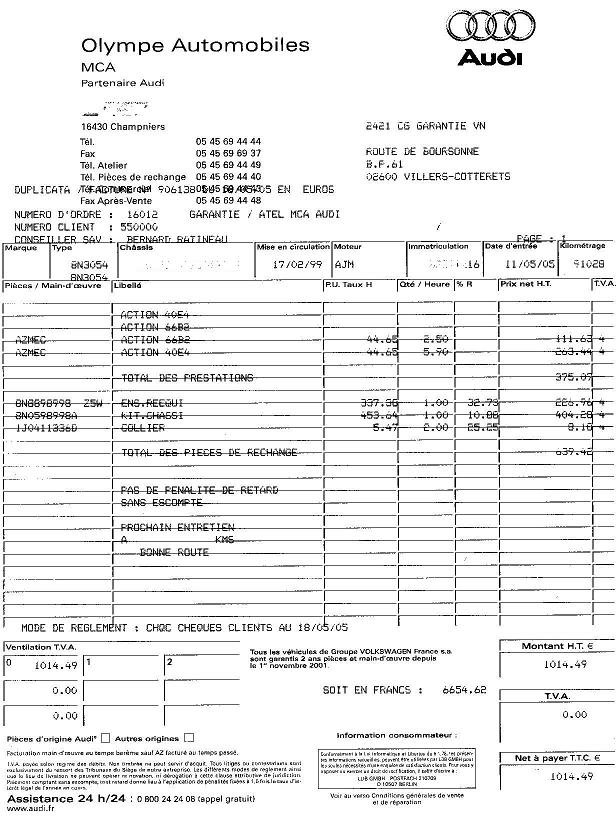 Salut, j'ai fais changer le train arrière Facture chez Audi 2200€ dont 2 pneus (complètement lissent a l'intérieur) 405€HT -