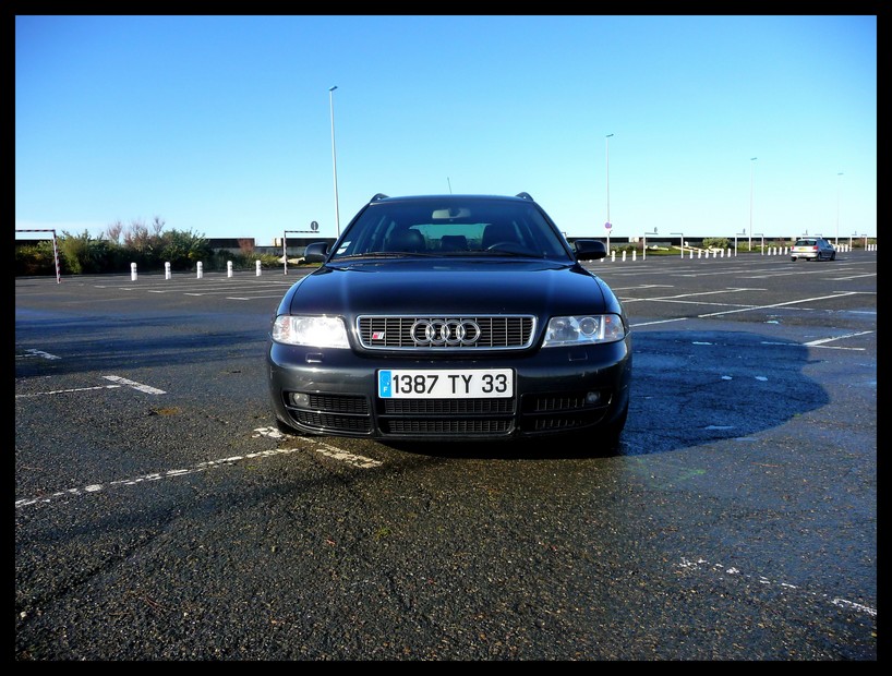 Bonsoir à tous ! Voila, apres avoir eu un passage 4x4, un passage 330D E46 reprogrammé bien bien chaussé en 19" (mais intérieur cuir inbuvable et à la finition bof bof ... <_< ) , un passage AUDI A6 Avant 2.5 V6 TDI 155 FULL OPTIONS qui m'a fait résolument craquer pour Audi ... :biere: , je vais , enfin MA PETITE FEMME :malelovies: va aller me chercher demain a 200km de la maison ( mon boulot m'empeche d'y aller ) un magnifique break AUDI S4 de aout 1999 , phase 1 donc. Nous sommes allés la voir et l'essayer sur Bordeaux (depuis la Rochelle il y a pire) samedi matin dernier . Elle a certes, connu 4 propriétaires en 122000km, MAIS TOUT son historique est retraçable et disponible dans un énorme dossier de factures que m'a fait consulter l'actuel propriétaire ( un pilote d'avion de ligne plutôt calme ). Toutes les factures proviennent à chaque fois de concessions AUDI, il doit y avoir une 30aine de facture quasiment (peut etre un peu moins), il y a meme le bon de commande de la voiture à l époque ! :exclamation: . Niveau équipement : Full cuir noir, un poste de navigation ALPINE (qui a couté la modique somme de 35000Fr à l époque il y a aussi la facture ! :blink: ) avec chargeur dans le coffre et écran rétractable, un systeme anti car jacking ( la voiture sonne au bout d'une minute et le moteur s'arrete si la formule magique n'a pas été faite en entrant dans la voiture ( elle a l avantage de ne pas etre contraignante a executer meme au quotidien ) , apres les classiques Xenon, regulateur de vitesse etc. On retiendra par contre : - Un kit suspension Bilstein :eldiablo: ( l'actuel propriétaire qui a l' S4 depuis 1 an ne savait pas ce que c'était :P ) - Un freinage à l avant composé de gros disques ventilés PERCéS (je pense à du RS4? :carre: ) - Un Glastint Carbone intégral Côté frais déja effectués recemment : -Débitmetre ( un debit metre BOSH est actuellement en place ) -Distribution et pompe a eau faite a 105mkm -Le fameux conduit en "Y" vient d'être remplacé il y a 500km ainsi que les 2 dump valves. Je pense vraiment partir sur une base tres saine, j'ai même l'impression d'avoir eu de la chance de tomber dessus et de l'avoir. Il était presque harcelé par les coups de fils. Son prix : 12900€ Maintenant place aux photos : Voilaaaaaaa !! La nuit et la journée de demain vont être très longues en attendant de rentrer du boulot à la maison !! (surtout avec la Ford KA (pas bi turbo :bigthumbup: :eldiablo: ) de ma fiancée... A vos commentaires !