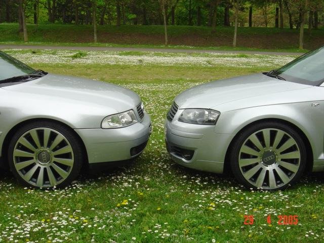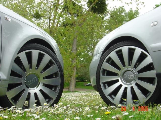 Slt je n'avais jamais fait attention à ce forum... et comme qui dirait y'a de la jante !! Plein de bien belles autos !! Bon j'ai une petite préférence pour le S4 Avant bleu Nogaro avec les RS6, ca lui va à ravir !!! entre autre trés bon choix.. Je n'ai que des photos de mes jantes ou je ne suis pas seul, je ne pense pas qu'il m'en voudras !!! Moi c'est l'A4 Old