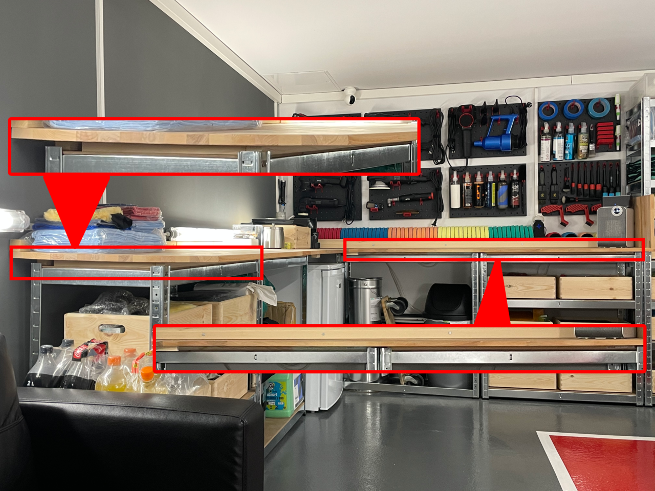 Non les tables de travail sont fixées par le dessous... En faite les étagères métalliques sont en bois fin... et comme les 4 coins des étagères métalliques sont surélevées de 8 mm par rapport à la dernière étagère du dessus, j'ai posé des tasseaux de 12 mm de haut et de 22 mm de large sur toute la longueur comme de la largeur, j'ai mit les planches de travail qui vont bien dessus, et vissé avec des vis de 20 mm de long par le dessous aux endroits où j'ai mit les tasseaux pour fixer le tout ensemble. Du coup ça ne bouge pas d'un iota... car cela m'a permis de fixer l'ensembles des 4 étagères entre elles via la table de travail. Comme tu le vois sur l'image ci-dessous et si tu clique dessus pour zoomer, tu vois bien les tasseaux de bois entre la dernière étagère du dessus et le plateau de travail, comme tu verras la surélévation de 8 mm des 4 coins métalliques... Qui justement justifie que j'y ait mit des tasseaux de bois de 12 mm d'épaisseurs. -
