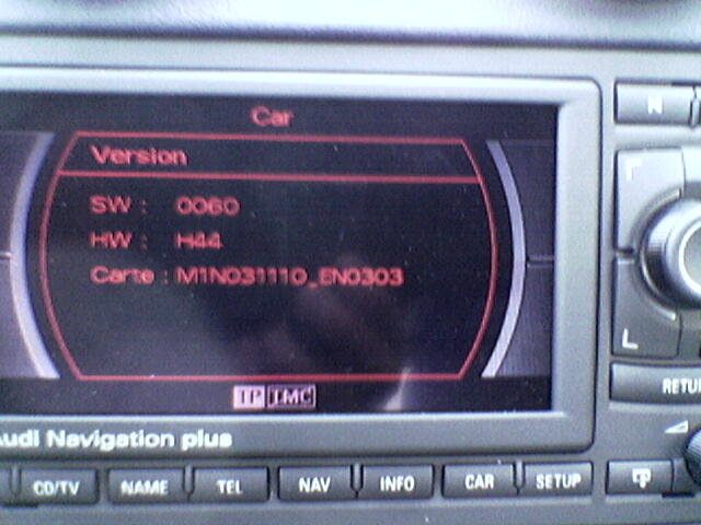 Bonjour, je suis tombé sur l'update de la version RNS-E (DVD 16/9) des dernières audi. Je l'ai essayé sur ma new A3 d'avril 2004 et ça fonctionne. Edit du 27/02 : Merci à ScubaDiver pour l'info : les DVD 2005 de mise à jour de cartographie contiennent cet upgrade de manière officielle. Alors un petit tour s'impose sur ebay.de AUDIPASSION ET MOI NE SOMMES RESPONSABLES DE RIEN SI VOUS TENTEZ LA MANIP ET SI CA NE MARCHE PAS CHEZ VOUS ET VOUS TUEZ VOTRE NAVI Avant la manip : Insertion du CD spécialement prévu à la place du DVD de Navigation (écran ouvert) : Ensuite on va sur le menu NAV, et la mise à jour commence : Et 5 bonnes minutes après (ne pas toucher au contact pendant ce temps là, c'est TRES long !!) : Voilà Pour l'instant pas beaucoup de changements si ce n'est : - plus de caractères affichés dans la liste des MP3 - le tri par nom est toujours en place même si on affiche le titre (de mémoire c'était trié par titre... pas pratique) - le système a l'air plus réactif - plus de choix Radio/tel sur le Navi (peut-être lié au fait que je n'ai pas de tel ) Reste à voir si ça améliore : - la stabilité (reboot sauvage dans certaines conditions - TMC en particulier :-/) - les bugs d'affichage du nom RDS des radios (style ÿ, ...) Et s'il y a des nouvelles features !