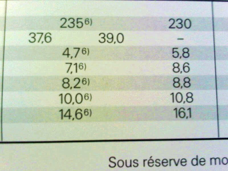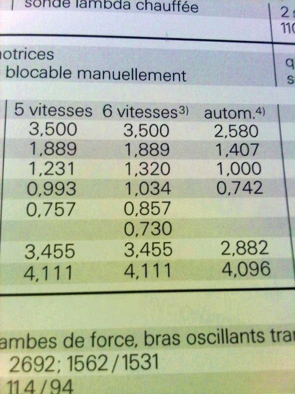 12. Salut ami des points d'exclamation, je ne veux pas casser ton trip mais la S4 ou la S6 sur circuit, ça risque de ne pas être aussi fun que tu crois, tout du moins sans amélioration sérieuse du freinage et du couple suspension/amortisseurs (+ barres antiroulis). Après, si tu es passionné de course de paquebot, ça peut le faire mais bon.. Pareil pour la vitesse de pointe, j'ai le dossier de presse pour la 100 S4 Avant. Il est marqué que la vitesse de pointe est identique pour les boites 5 et 6. Sur la première photo tu as les coefs de démultiplication pour chaque rapport (boite 5 tout à gauche évidemment) Sur la seconde, le 235 indique la vitesse max et dessous tu as des temps genre 0-80km/h, 0-100km/h et conso Sur la troisième, l'explication du (6) à côté du 235 sur la deuxième photo. A+ Xavier