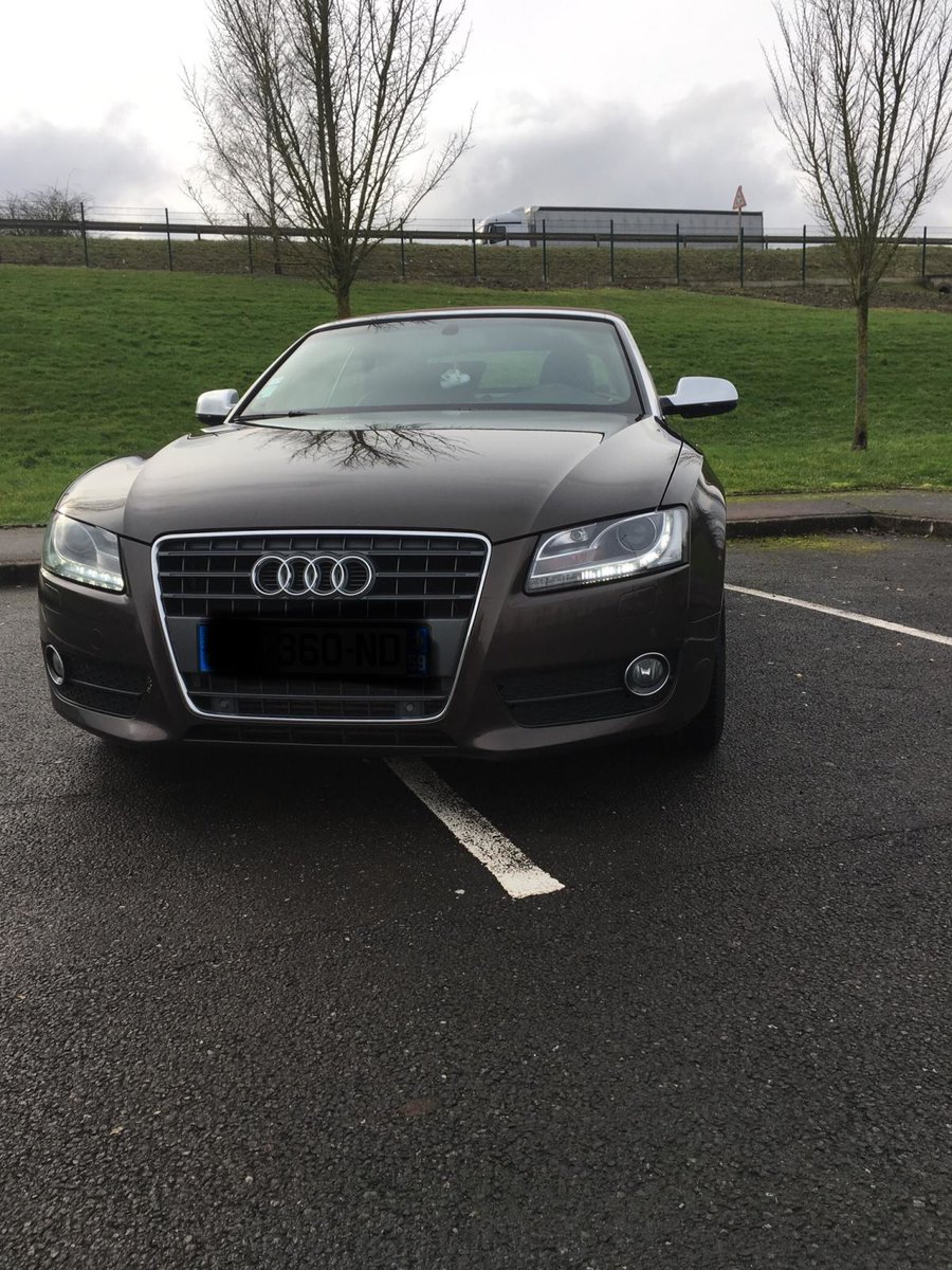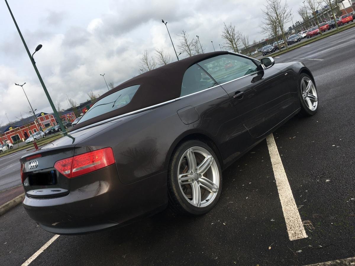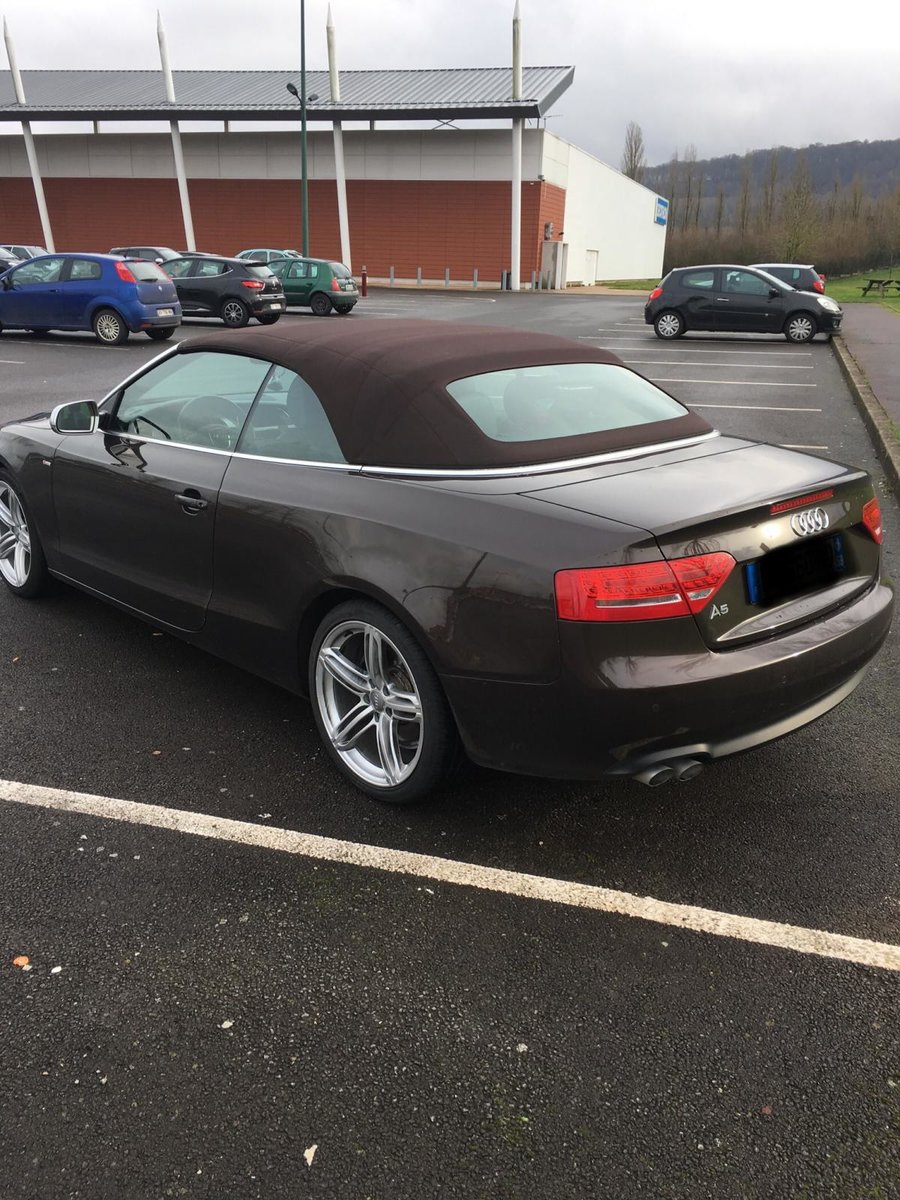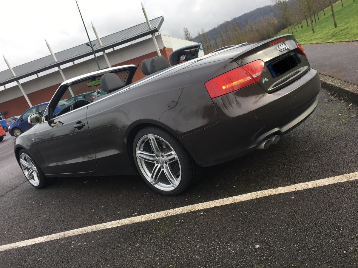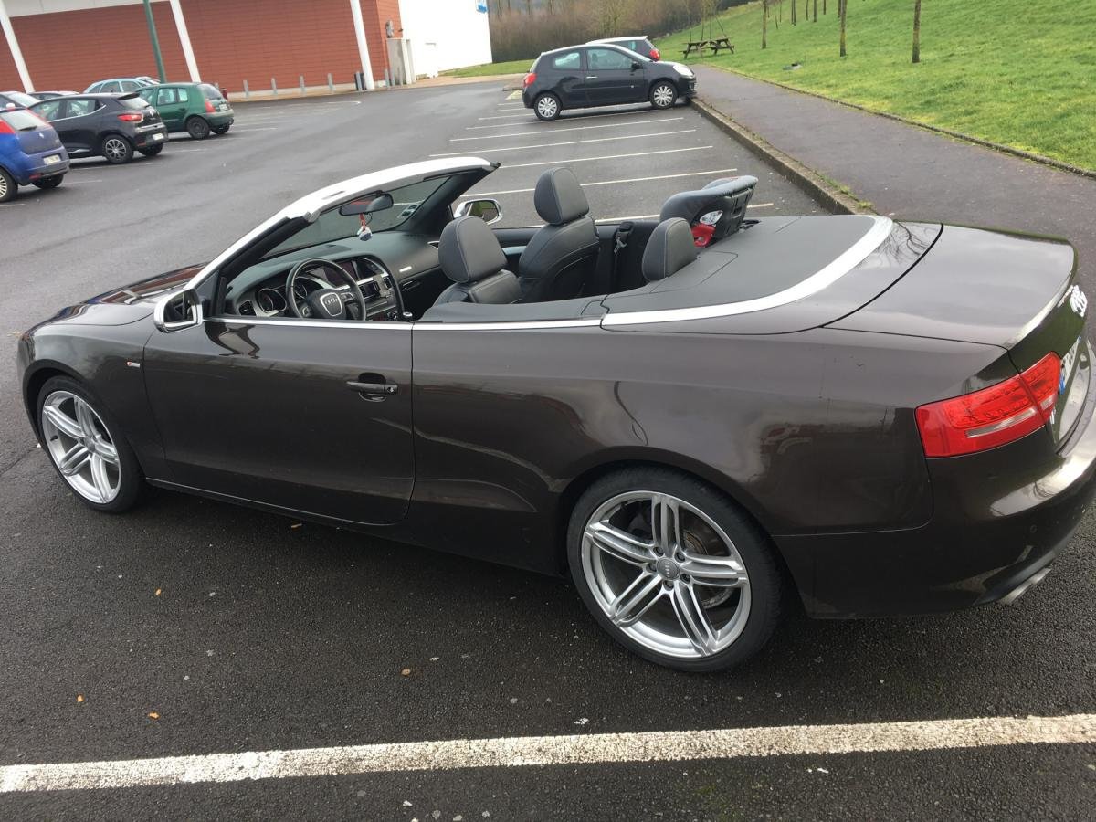 Salut! J’ai pas de photos sous la main, mais je vais en faire et je les posterai bientôt. Sinon c’est une A5 cabriolet 2.0 TDI S-Line de 2010 C’est une 1ère main, avec entretien exclusif Audi, avec tout ses papiers, ses factures, son carnet, son double et triple de clefs. Elle appartenait à un couple qui devait avoir un peu moins de la soixantaine, mais c’était la voiture de madame car monsieur avait une voiture de fonctIon au delà de sa Porsche et son 4x4! Elle est couleur chocolat, intérieur noir et alu, jantes 19 " style RS6, pack Alu, keyless, 3G, souffle nuque, etc... enfin, il y a en tellement que je ne sais plus ce qui est en option... disque dur, cartes mémoires, rétros rabbatables, bluetooth, sièges chauffants, vitres teintées, détecteurs avant, et bien d’autres encore... Bref, elle est pas mal je trouve...