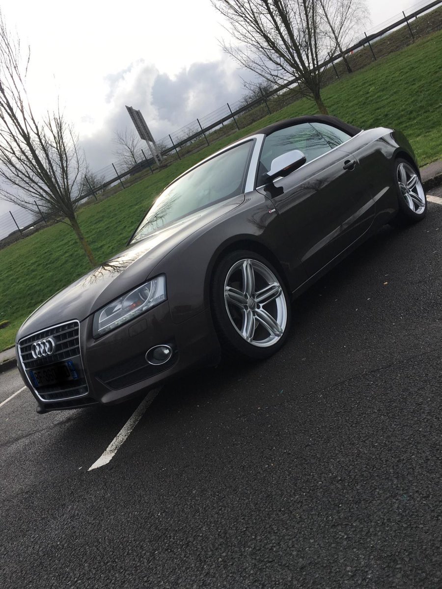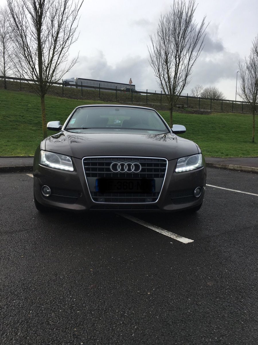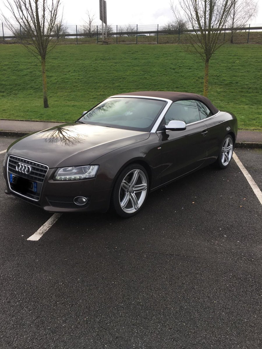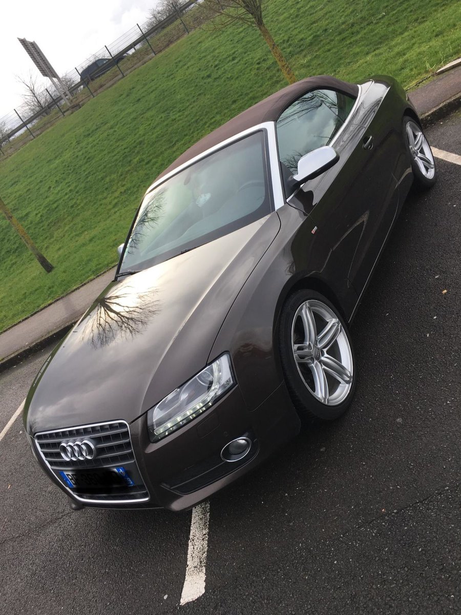 Salut! J’ai pas de photos sous la main, mais je vais en faire et je les posterai bientôt. Sinon c’est une A5 cabriolet 2.0 TDI S-Line de 2010 C’est une 1ère main, avec entretien exclusif Audi, avec tout ses papiers, ses factures, son carnet, son double et triple de clefs. Elle appartenait à un couple qui devait avoir un peu moins de la soixantaine, mais c’était la voiture de madame car monsieur avait une voiture de fonctIon au delà de sa Porsche et son 4x4! Elle est couleur chocolat, intérieur noir et alu, jantes 19 " style RS6, pack Alu, keyless, 3G, souffle nuque, etc... enfin, il y a en tellement que je ne sais plus ce qui est en option... disque dur, cartes mémoires, rétros rabbatables, bluetooth, sièges chauffants, vitres teintées, détecteurs avant, et bien d’autres encore... Bref, elle est pas mal je trouve...