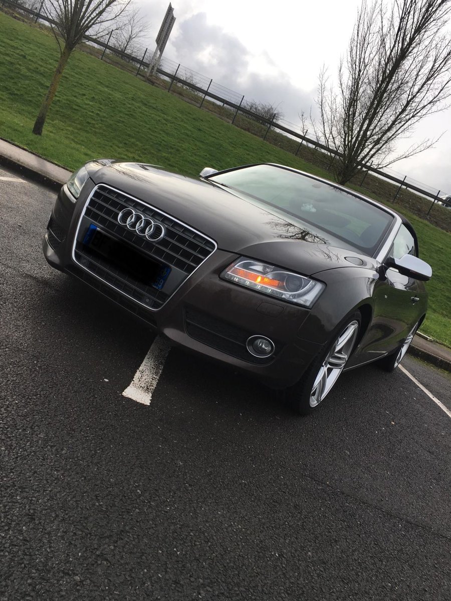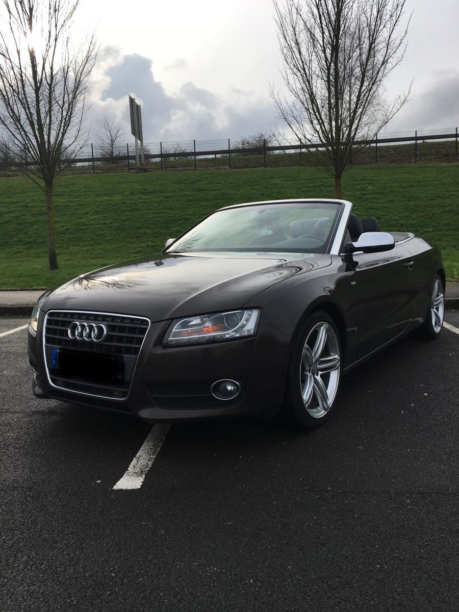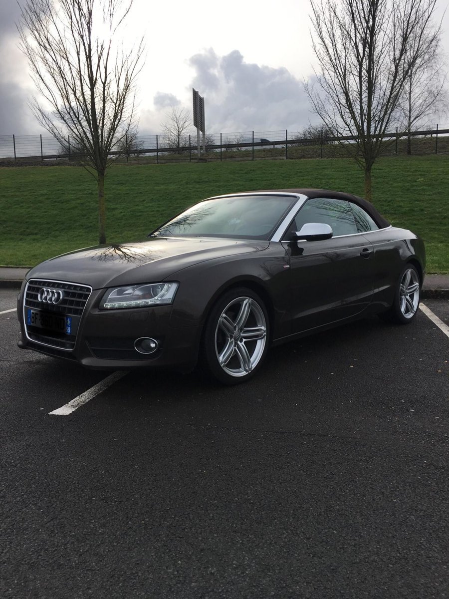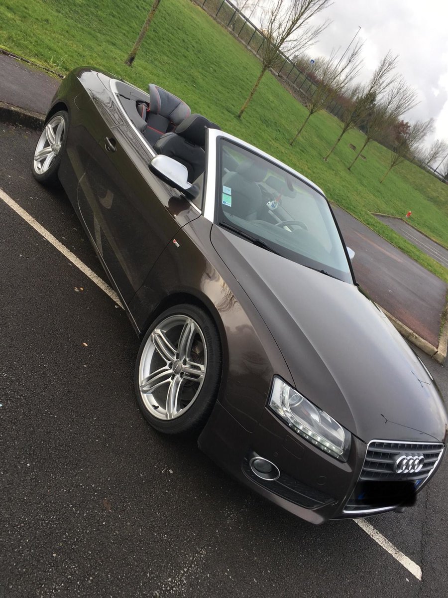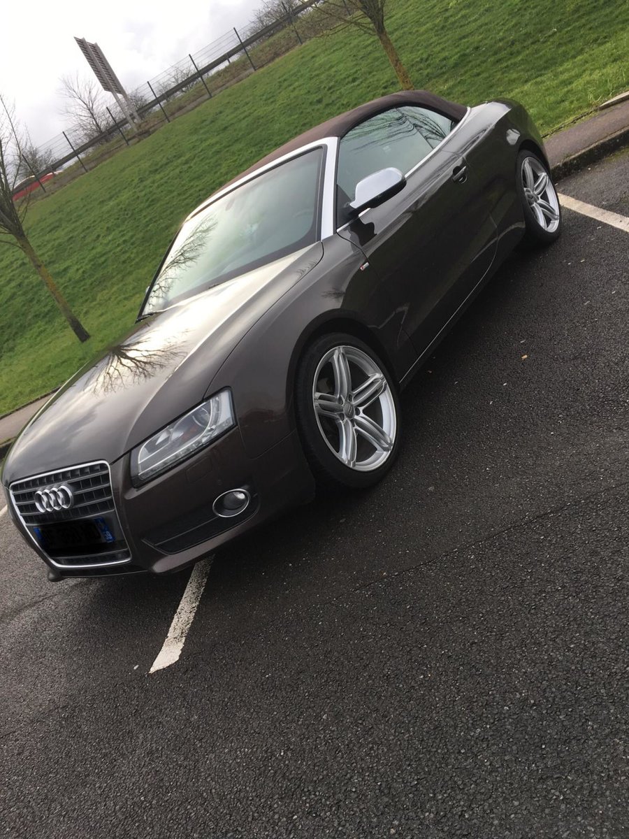 Salut! J’ai pas de photos sous la main, mais je vais en faire et je les posterai bientôt. Sinon c’est une A5 cabriolet 2.0 TDI S-Line de 2010 C’est une 1ère main, avec entretien exclusif Audi, avec tout ses papiers, ses factures, son carnet, son double et triple de clefs. Elle appartenait à un couple qui devait avoir un peu moins de la soixantaine, mais c’était la voiture de madame car monsieur avait une voiture de fonctIon au delà de sa Porsche et son 4x4! Elle est couleur chocolat, intérieur noir et alu, jantes 19 " style RS6, pack Alu, keyless, 3G, souffle nuque, etc... enfin, il y a en tellement que je ne sais plus ce qui est en option... disque dur, cartes mémoires, rétros rabbatables, bluetooth, sièges chauffants, vitres teintées, détecteurs avant, et bien d’autres encore... Bref, elle est pas mal je trouve...