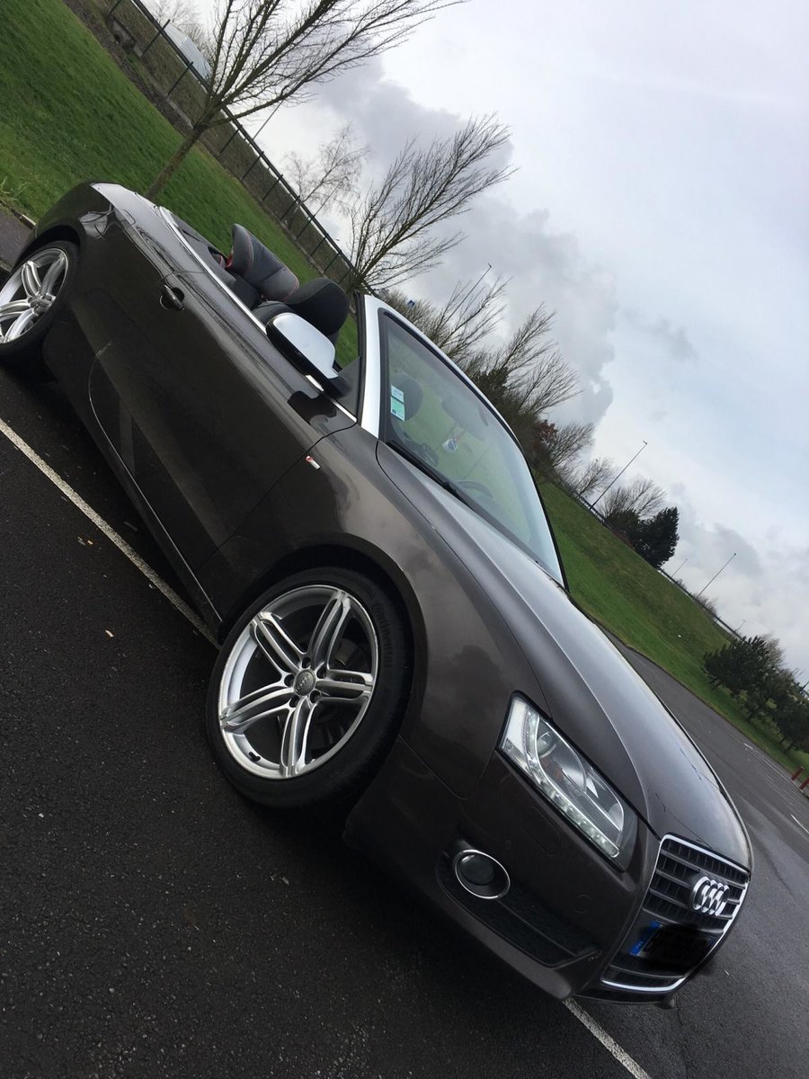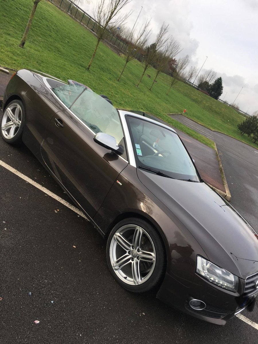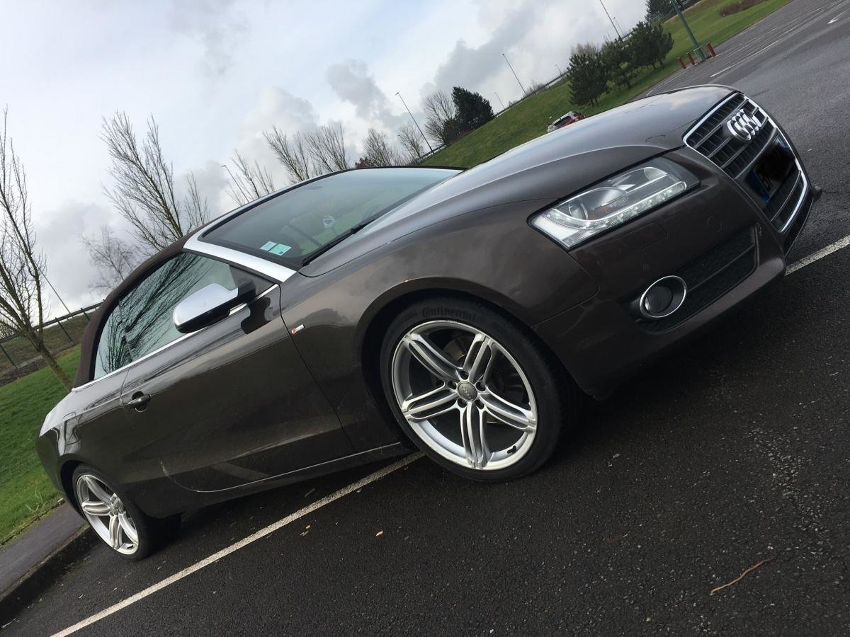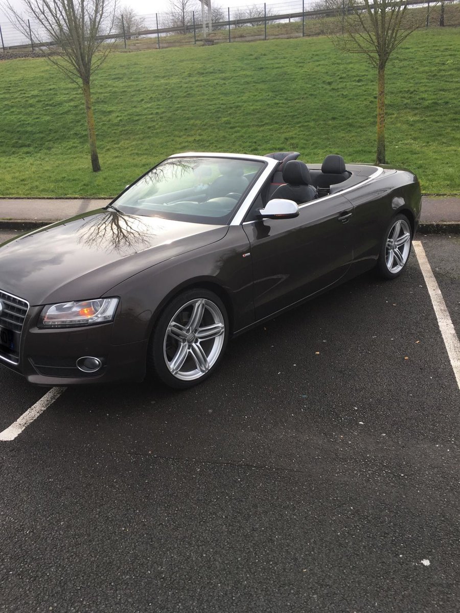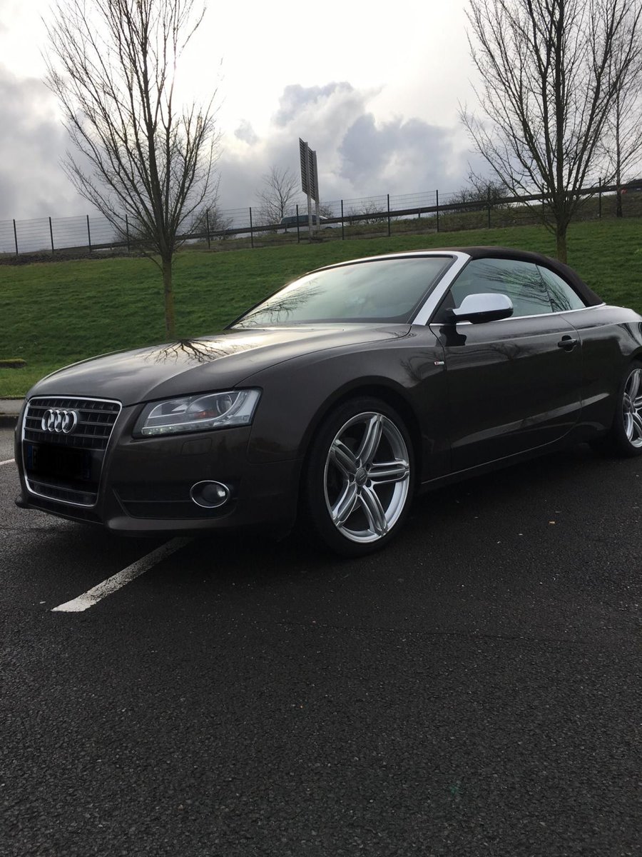 Salut! J’ai pas de photos sous la main, mais je vais en faire et je les posterai bientôt. Sinon c’est une A5 cabriolet 2.0 TDI S-Line de 2010 C’est une 1ère main, avec entretien exclusif Audi, avec tout ses papiers, ses factures, son carnet, son double et triple de clefs. Elle appartenait à un couple qui devait avoir un peu moins de la soixantaine, mais c’était la voiture de madame car monsieur avait une voiture de fonctIon au delà de sa Porsche et son 4x4! Elle est couleur chocolat, intérieur noir et alu, jantes 19 " style RS6, pack Alu, keyless, 3G, souffle nuque, etc... enfin, il y a en tellement que je ne sais plus ce qui est en option... disque dur, cartes mémoires, rétros rabbatables, bluetooth, sièges chauffants, vitres teintées, détecteurs avant, et bien d’autres encore... Bref, elle est pas mal je trouve...