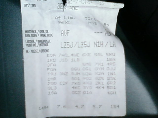 bonjour a tous. j'aurais voulu savoir qu'elle été ma version d'A4 ?es une pack ou une pack plus ou autre? j'ai regarder tous les sujets du forum et je m'enbrouille il y a trop de variante . je suis sur que vu vos conaissance sur ce modele vous pourriez trouvé parce que moi la sa me rend fou. :hot: ps vehicule import d'allemagne. audi a4 de mai 2004 avec 140000 km. interieur cuir chauffant et semi elec volant ,levier de vitesse cuir odb en allemand mais bon climatronik et parktronic a l'arriere regulateur de vitesse poste cd blauckpunt je sai pas si origine vitre electrique a l'avant et teinté retro electrique rabatable interieur ronce de noyer alarme jante 16 pouce baguette contour porte alu phare automatique reglable en hauteur antibrouillard avec reglage au tableau de bord pour l'eclairage descente de la voiture retroviseur interieur jour et nuit auto pare brise avec bandeau anti soleil en gros il doit me manquer que les xenons ,le gps ,vitre elec a l'arriere je joint la liste des options (la photo est un peu flou desolé apn en panne ,fait au portable) merci a tous pour vos reponses :coucou:
