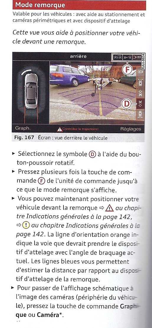 bonjour à tous , je possède une a6 c7 avec crochet d'attelage seconde monte westfalia, jusque la tout est normal. je m’aperçois que sur la monte audi pivotant il y a un connecteur supplémentaire Ma premier question : c'est un connecteur à combien de fils ? deuxième : ou arrive ces fils sur le boitier 4g8907383 avec codage 01090000000 le pourquoi du comment, je peux lire dans le manuel la chose suivante : sauf que je possede les cameras périmetrique mais je n'arrive pas à activer cette fonction ? je ne peux mettre 010908 en codage car le 08 me génère un défaut lorsque l'on lit le module 10 parklife j'ai crochet d'attelage manuel et non l'autre choix attelage électrique. Si quelqu'un possède la fonction, je suis tout ouïe Merci -