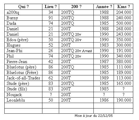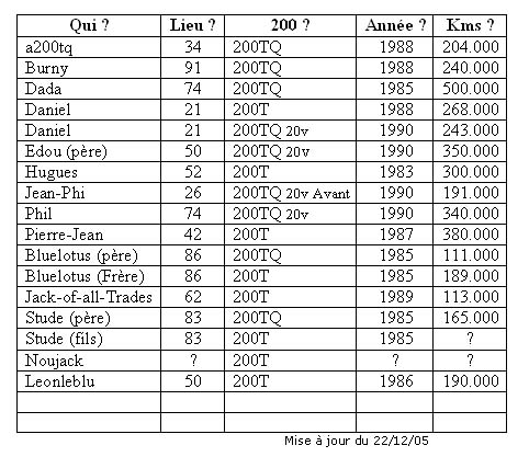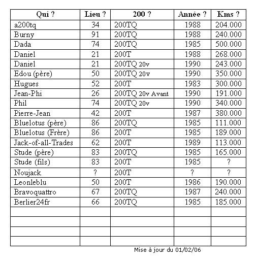 Nickel, la liste s'allonge! J'espère que toutes les 200 ont bien passé les fêtes, qu'il n'y a pas eu de tôles froissées, ni de mise à la casse. Moi, je viens de changer les 4 amortisseurs et comme à chaque fois, je m'émerveille de la différence entre "avant" et "après". C'est fou comme on s'abitue aux défauts de nos protègées. Bonne route à tous. PJ -